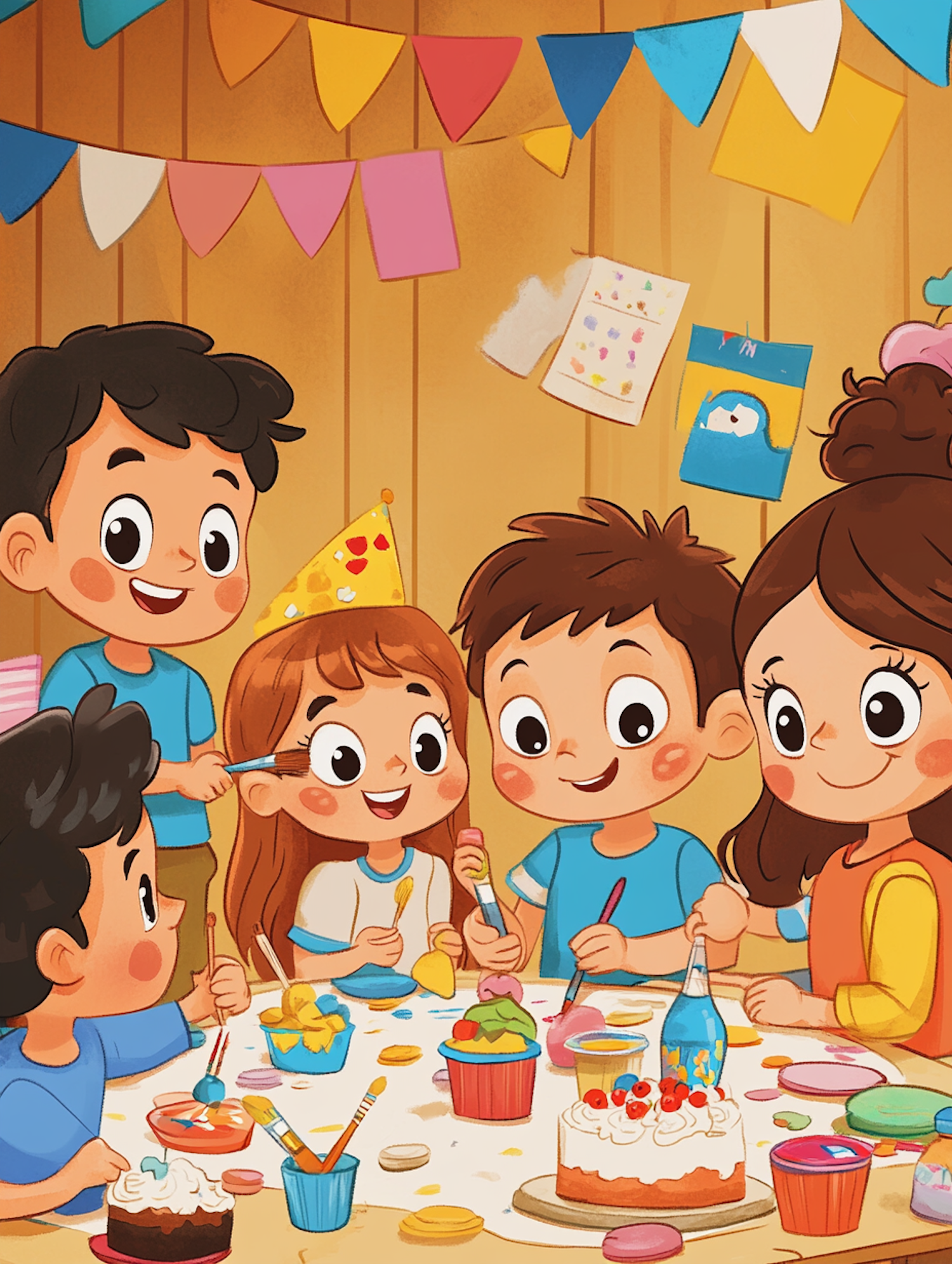 Children joyfully decorating cupcakes at a colorful party, surrounded by art supplies and festive decorations.
