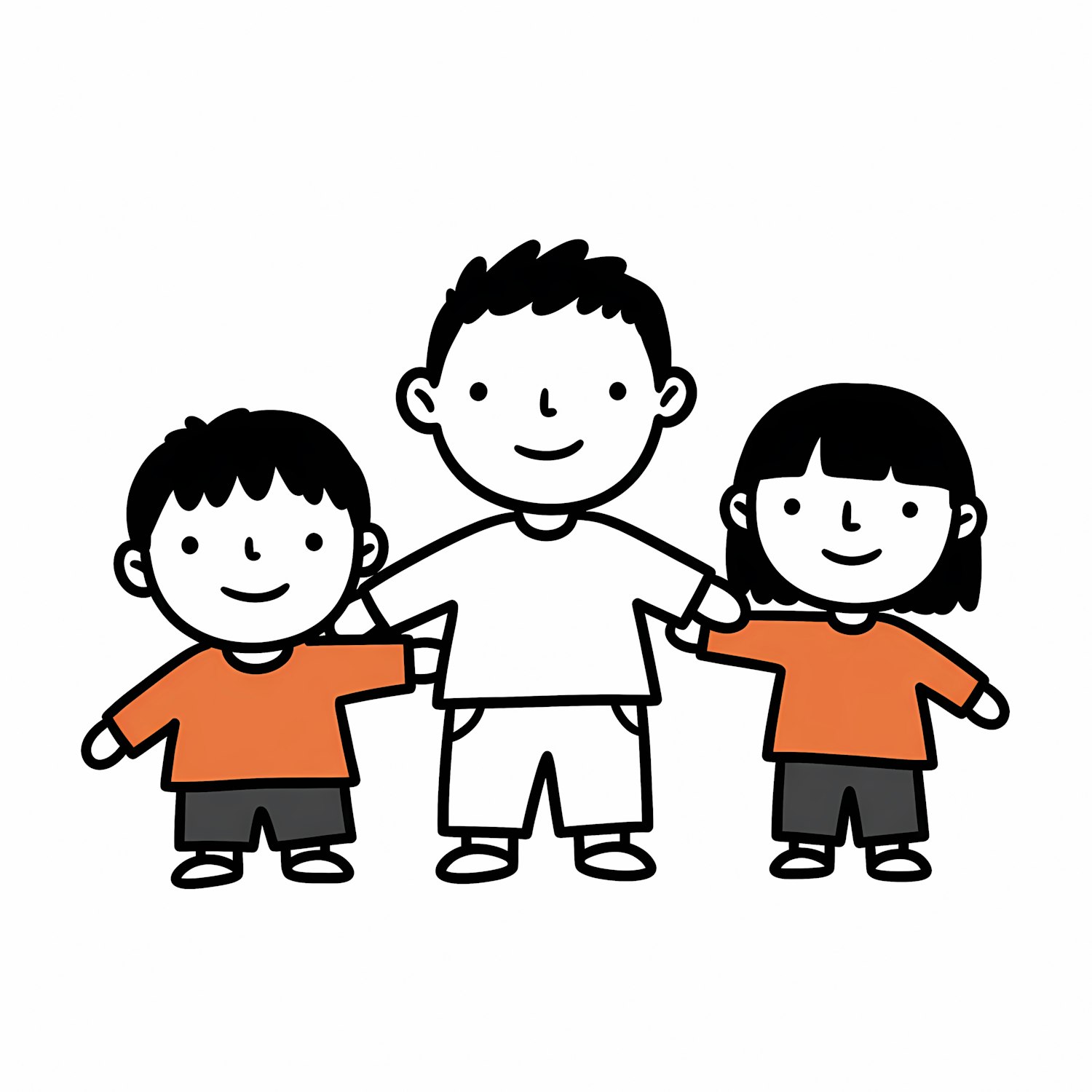 A cute cartoon illustration of three children holding hands, dressed in orange and white, with a clean white background.