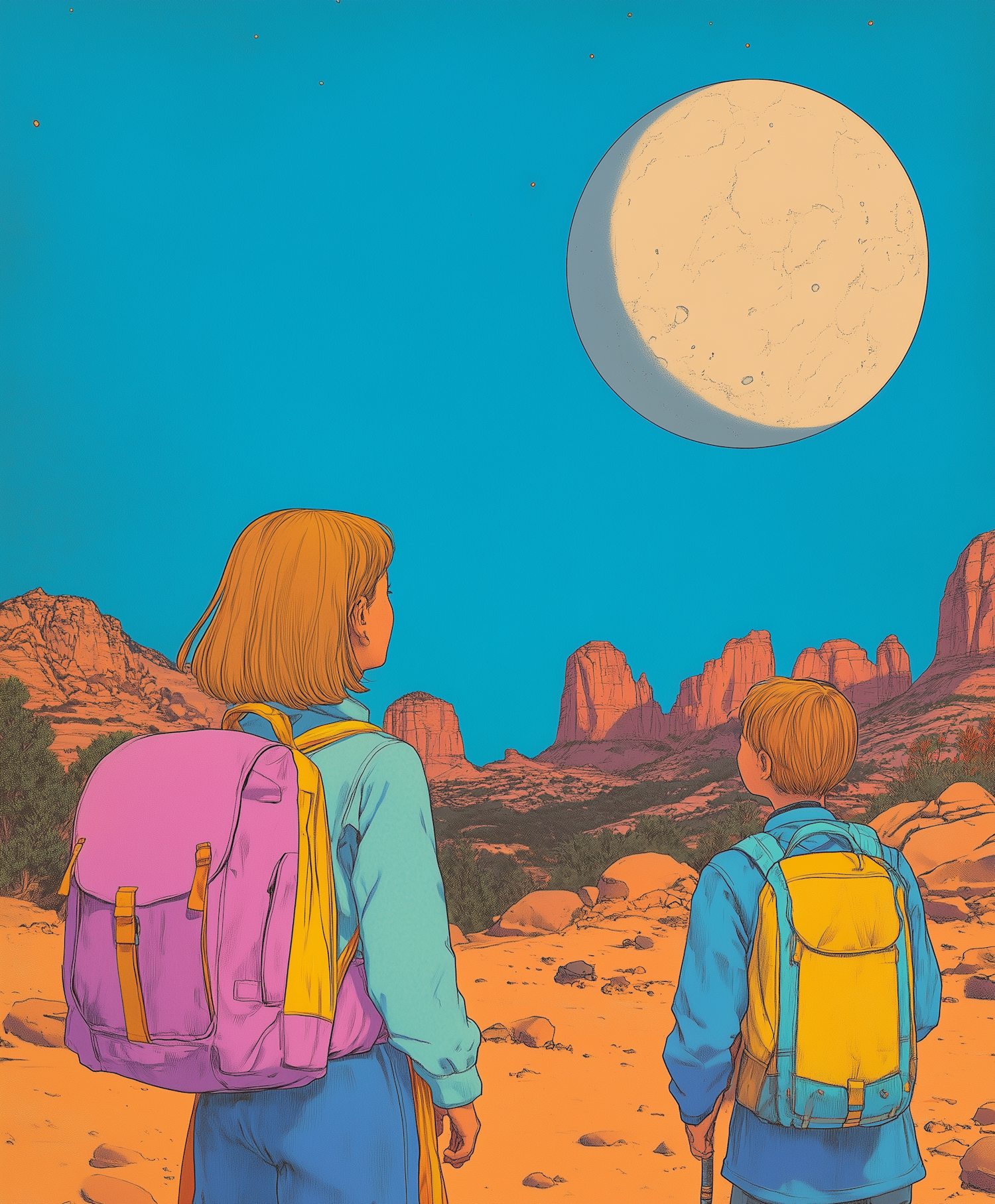 Two children with backpacks gaze at a large moon in a desert landscape, surrounded by red rock formations under a clear blue sky.