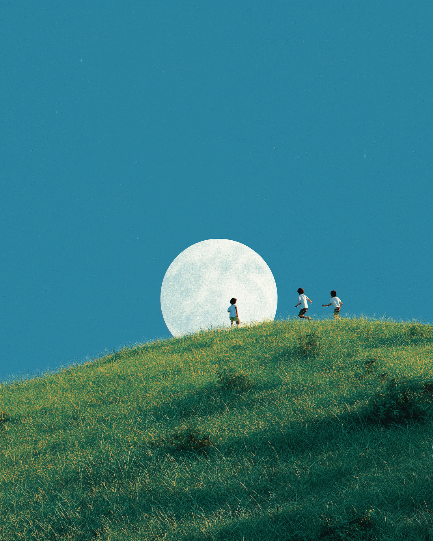 Three children play on a grassy hill under a clear blue sky with a large full moon in the background, creating a serene and dreamlike scene.