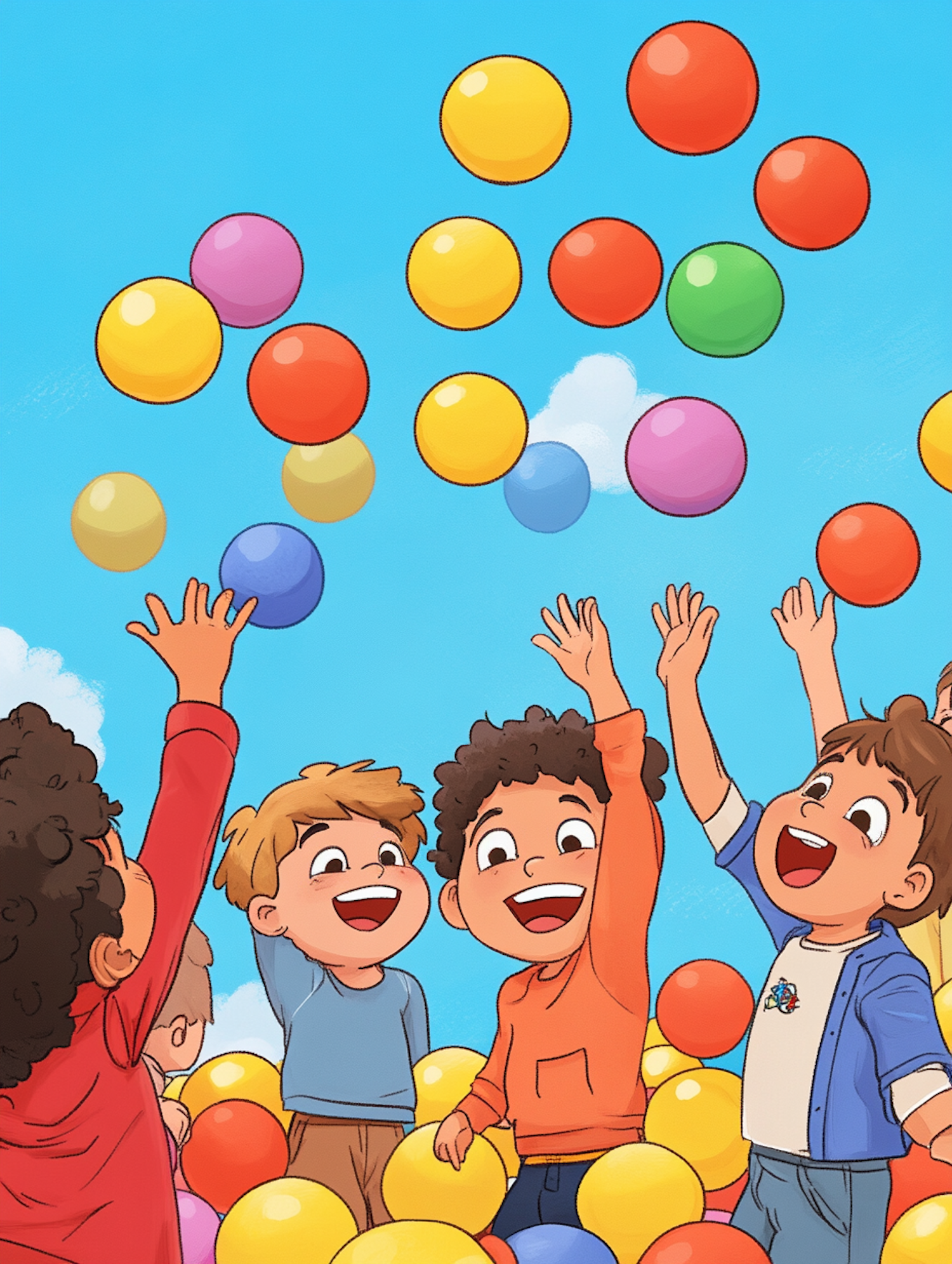 Illustration of happy children playing with colorful balls under a bright blue sky, radiating joy and energy.