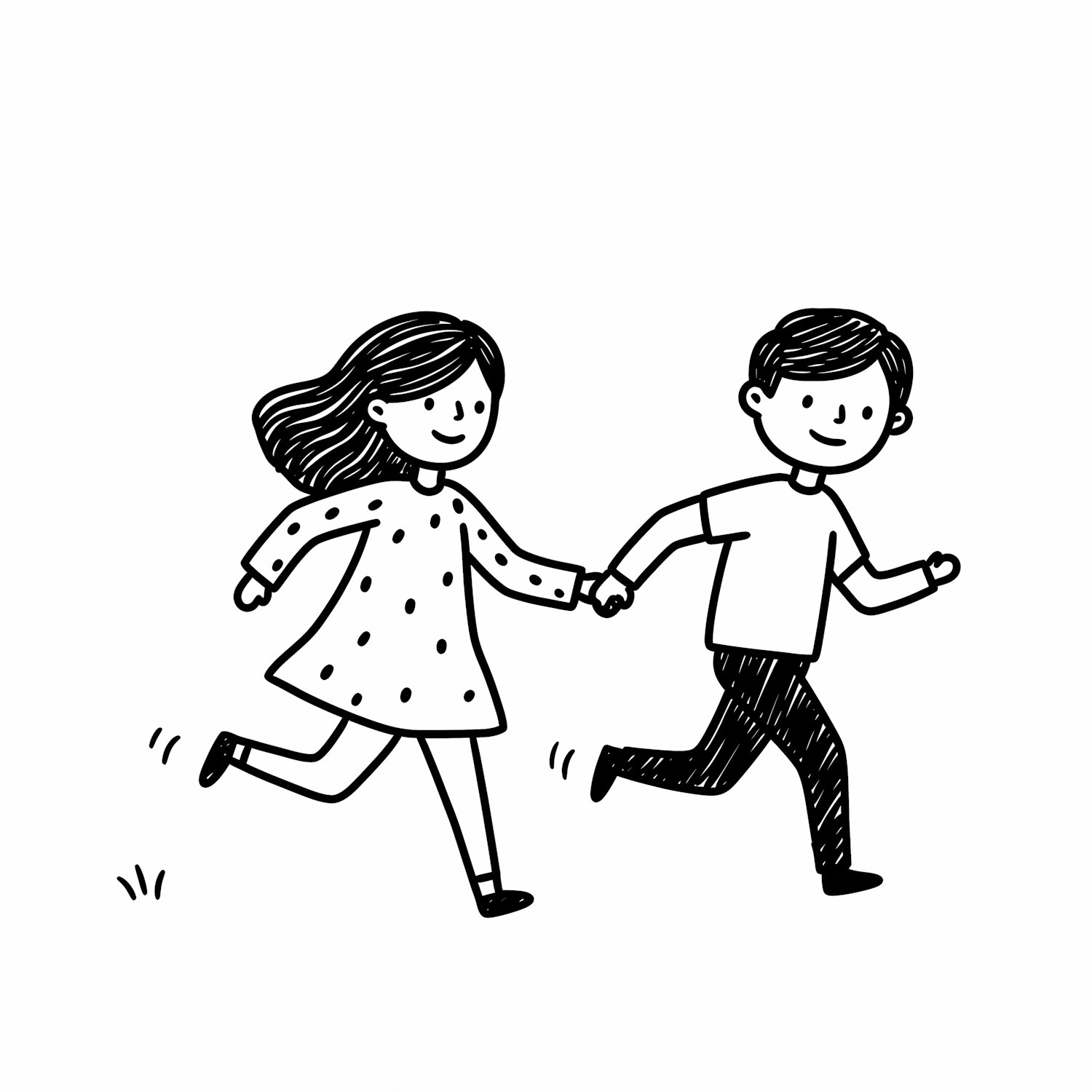 A charming black-and-white illustration of two children running hand in hand, showcasing a playful and joyful moment.