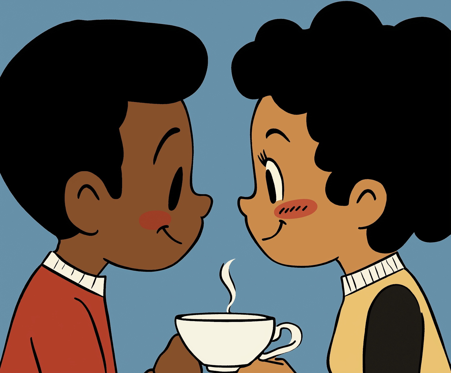 Two cartoon characters share a warm moment with a steaming cup, set against a blue background. Simple and colorful illustration.