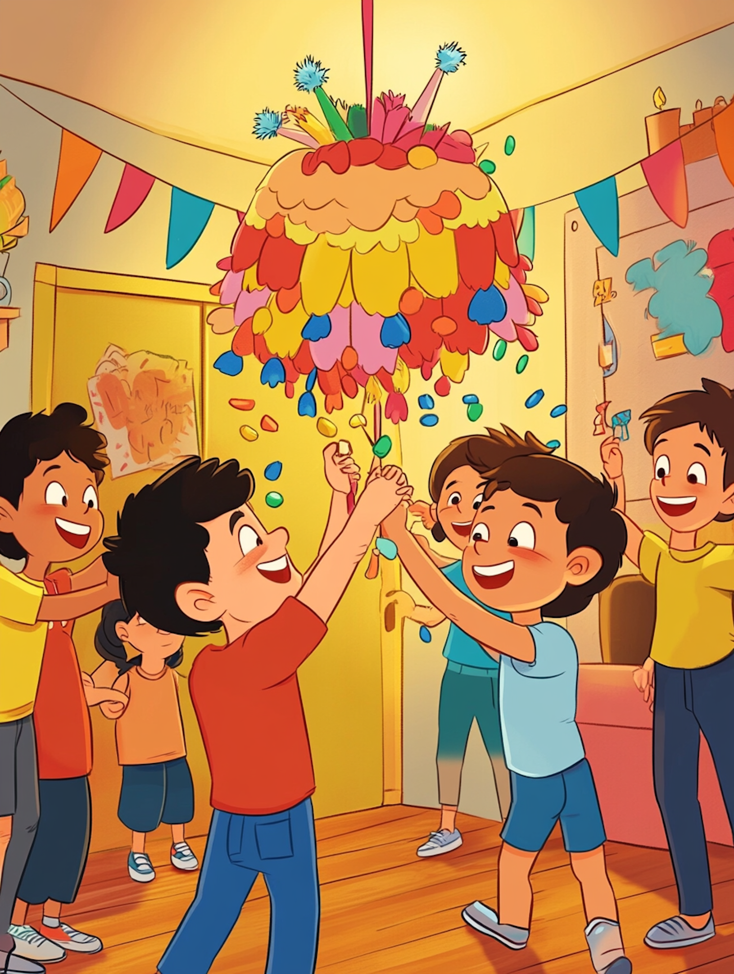Children joyfully celebrate indoors with a colorful piñata, surrounded by festive decorations and vibrant confetti.