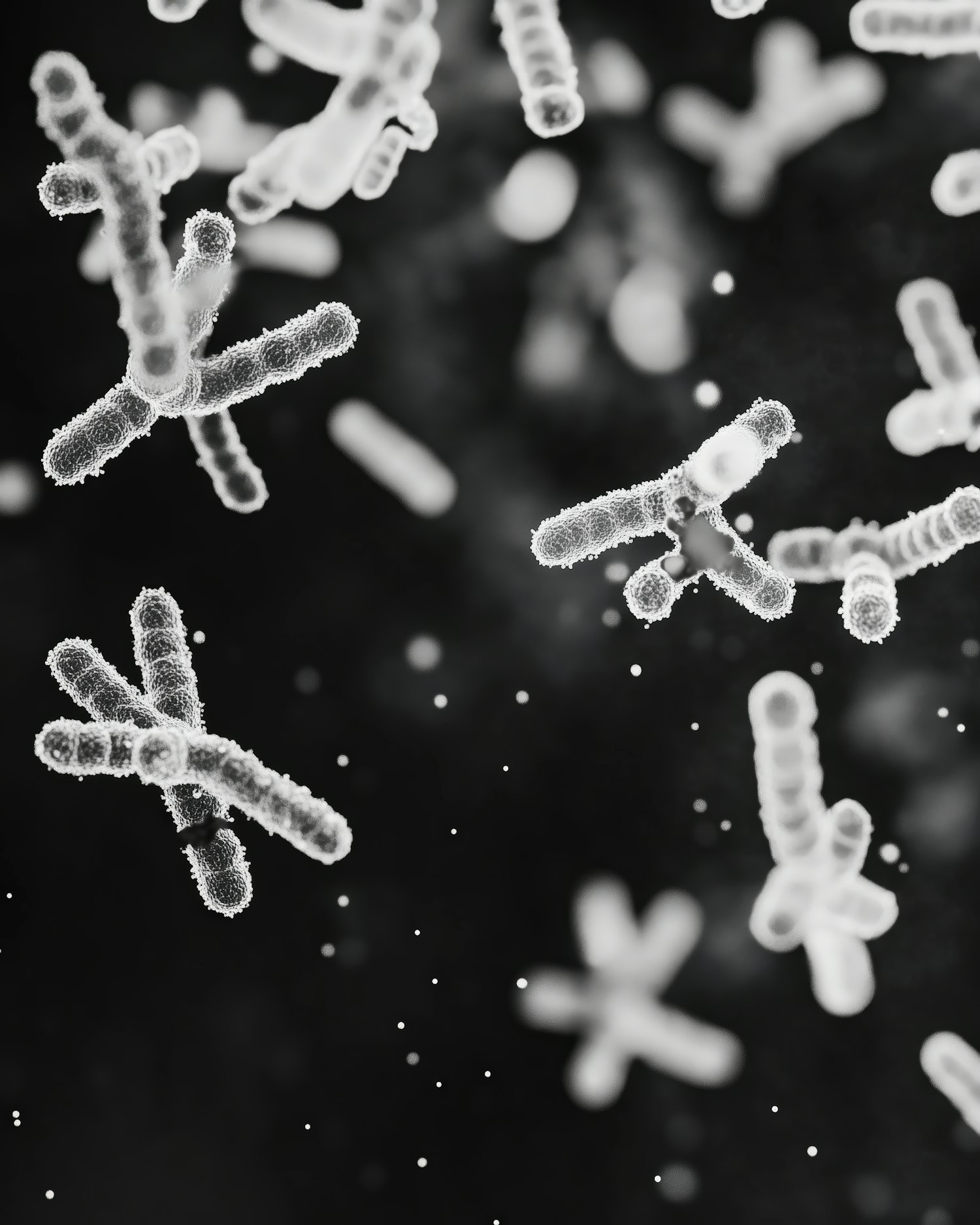 High-resolution grayscale visualization of chromosomes with textured surfaces, set against a dark background with scattered particles.
