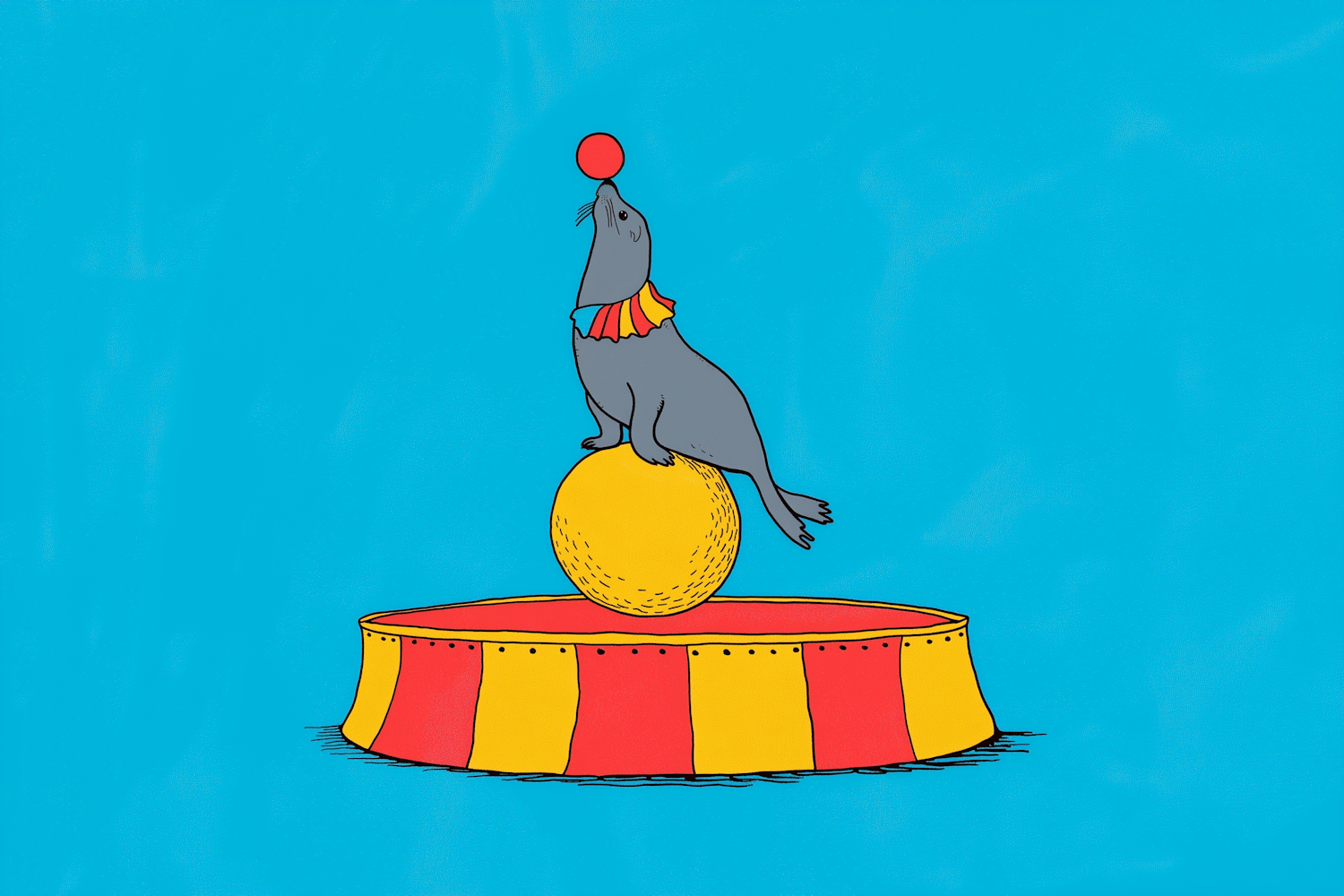 A cartoon seal balances a red ball on its nose while perched on a yellow ball in a colorful circus ring against a blue background.