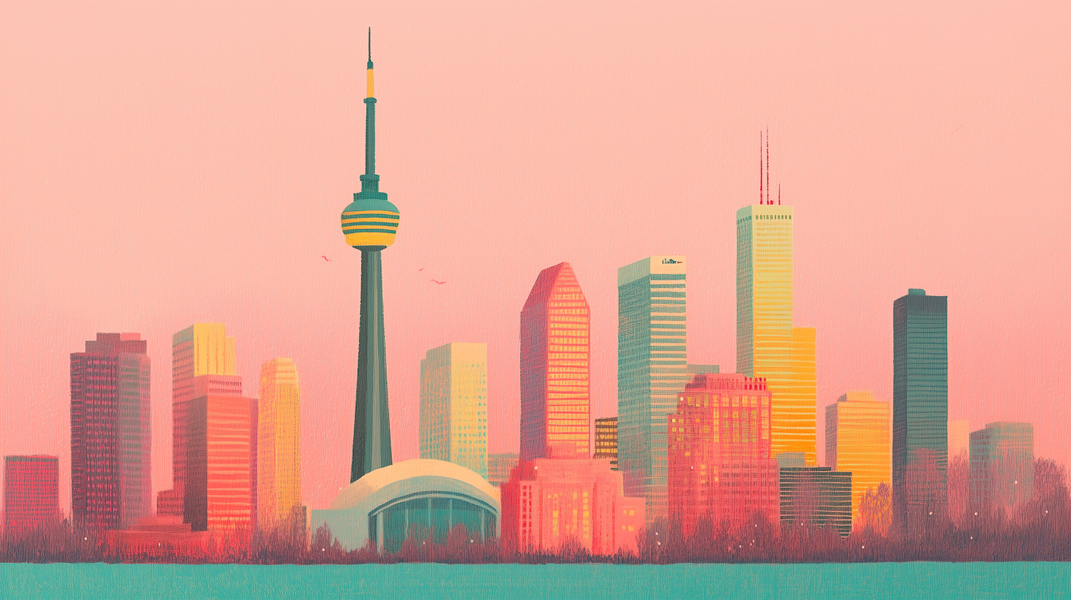 A dreamy illustration of a city skyline with the CN Tower at sunset, featuring warm pink and orange hues and a tranquil waterfront.