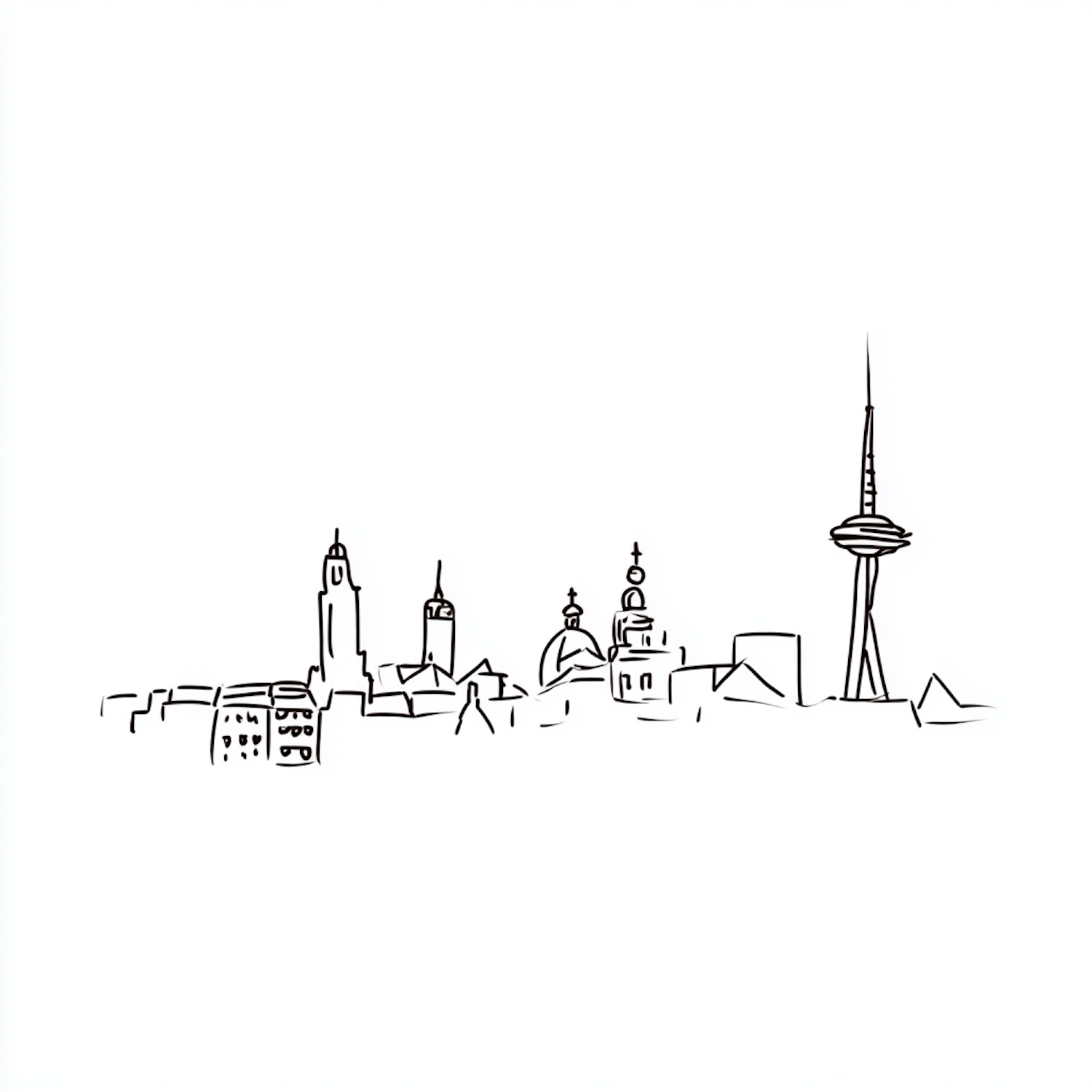 Minimalist line art of a city skyline with domes, spires, and a tall tower, set against a blank background for a clean aesthetic.