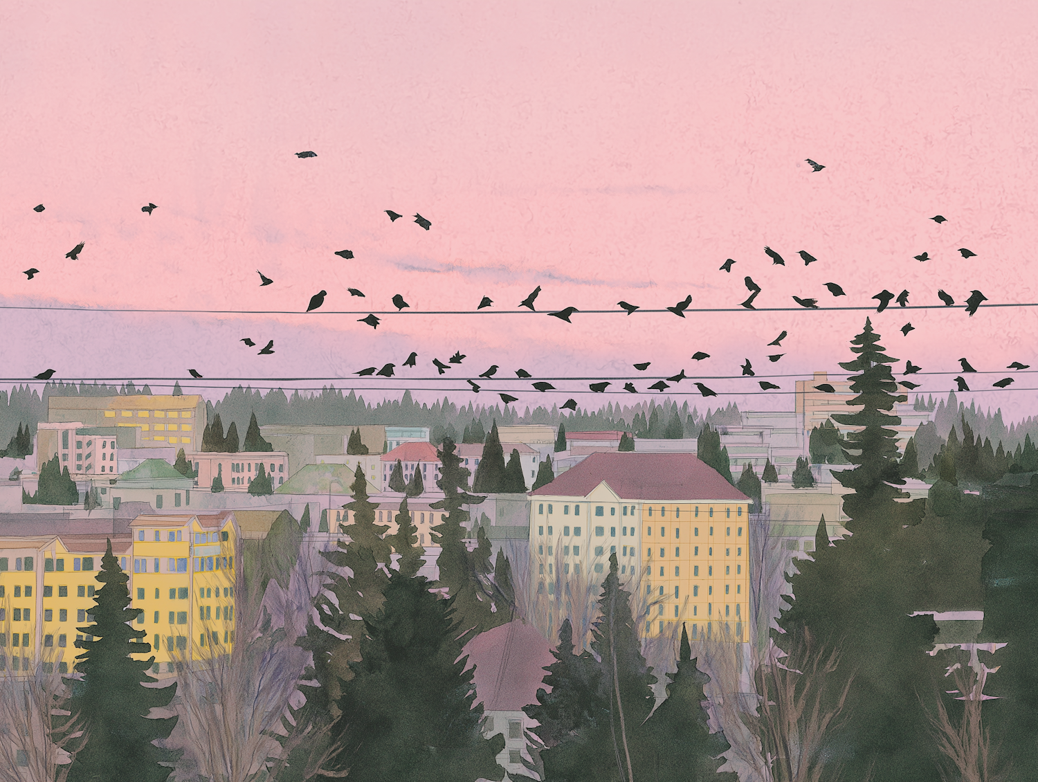 A peaceful cityscape illustration at dusk with birds on power lines, pastel-colored buildings, and a pink sky, evoking a calm atmosphere.