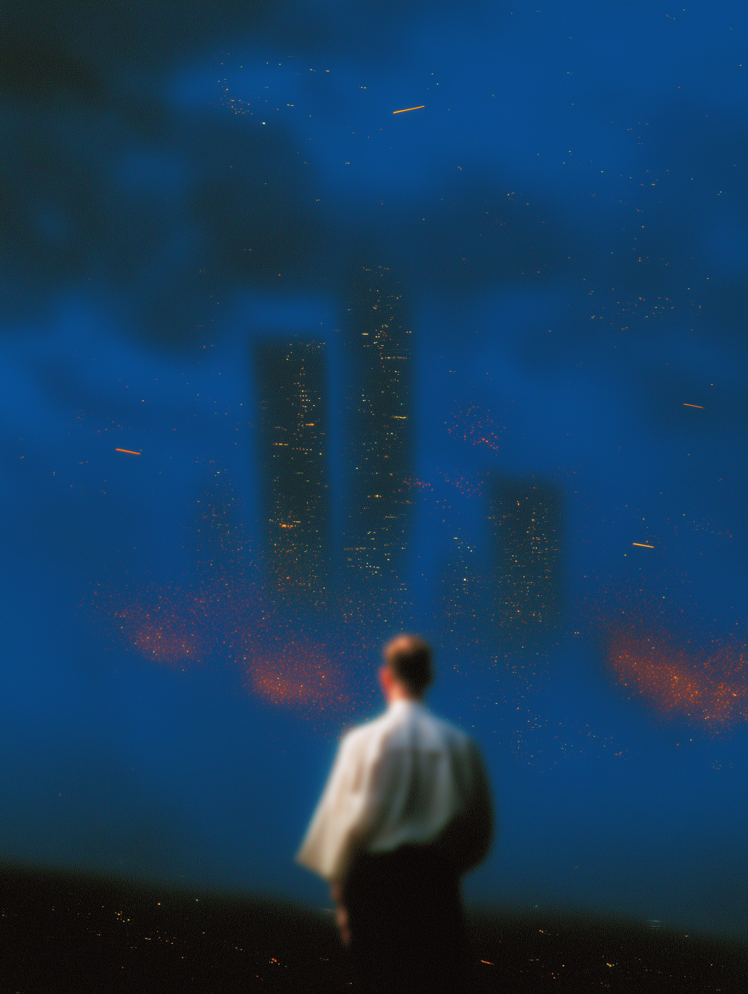 A person in a white shirt gazes at a distant cityscape under a blue haze, with glowing orange lights creating a surreal atmosphere.