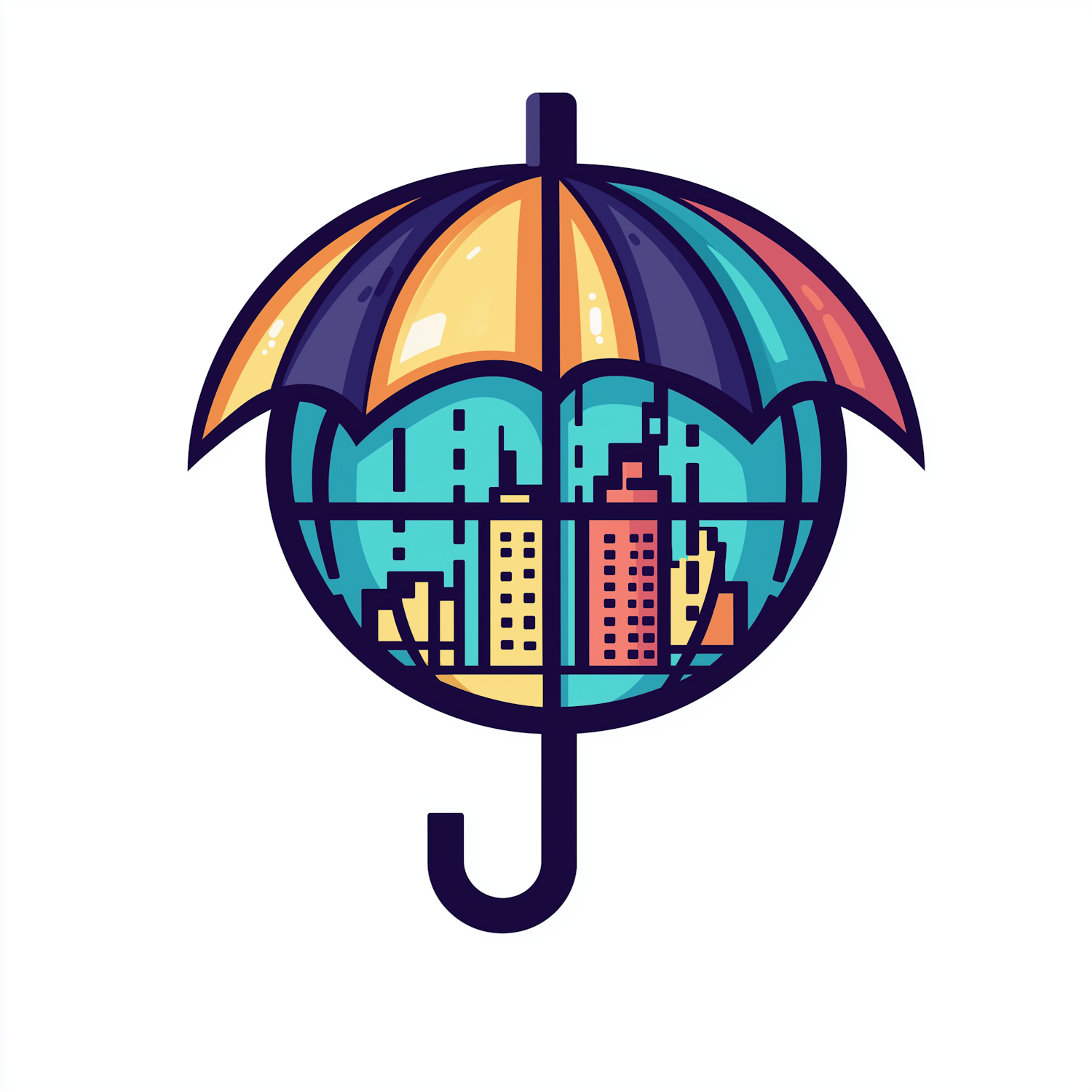 Colorful illustration of an umbrella with a cityscape inside, blending urban and protective themes in a modern, artistic style.