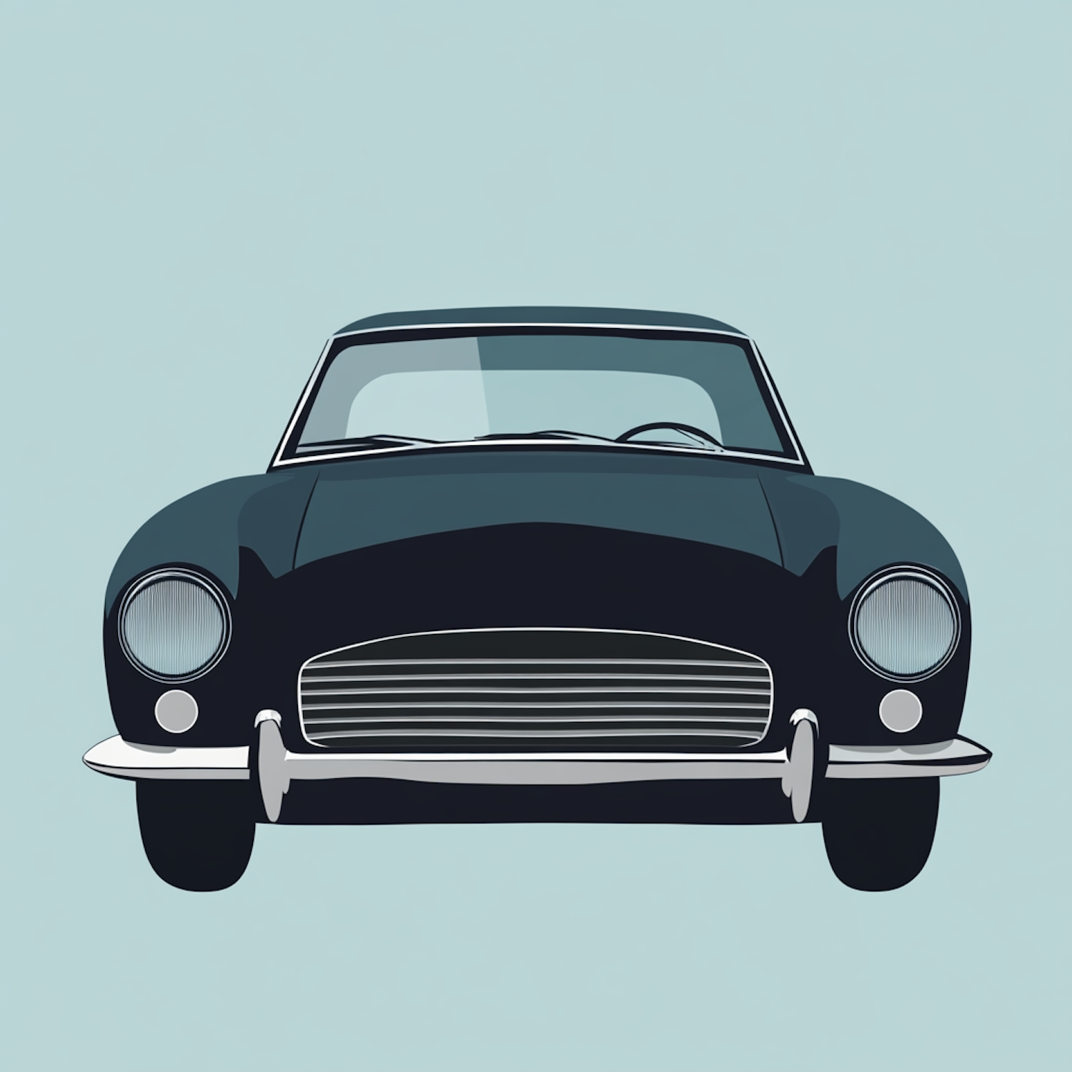 Stylized illustration of a classic car front view with chrome grille and round headlights on a light blue background.