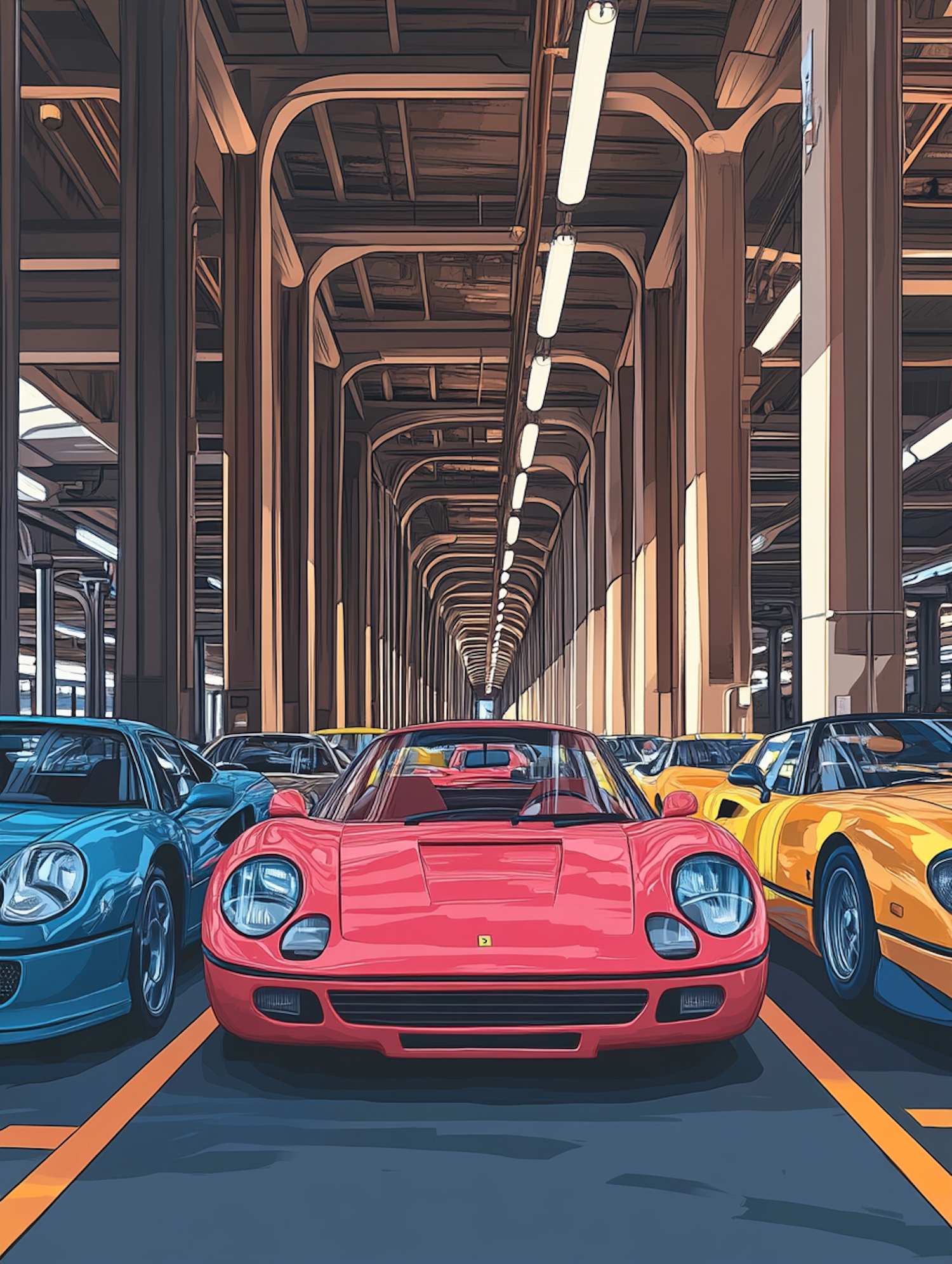 Illustration of a classic car lineup in a spacious garage with red, blue, and yellow sports cars under industrial-style lighting.