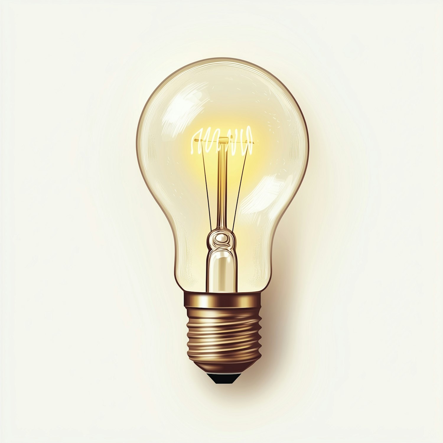 A beautifully detailed illustration of a glowing incandescent light bulb with a warm yellow filament on a clean white background.