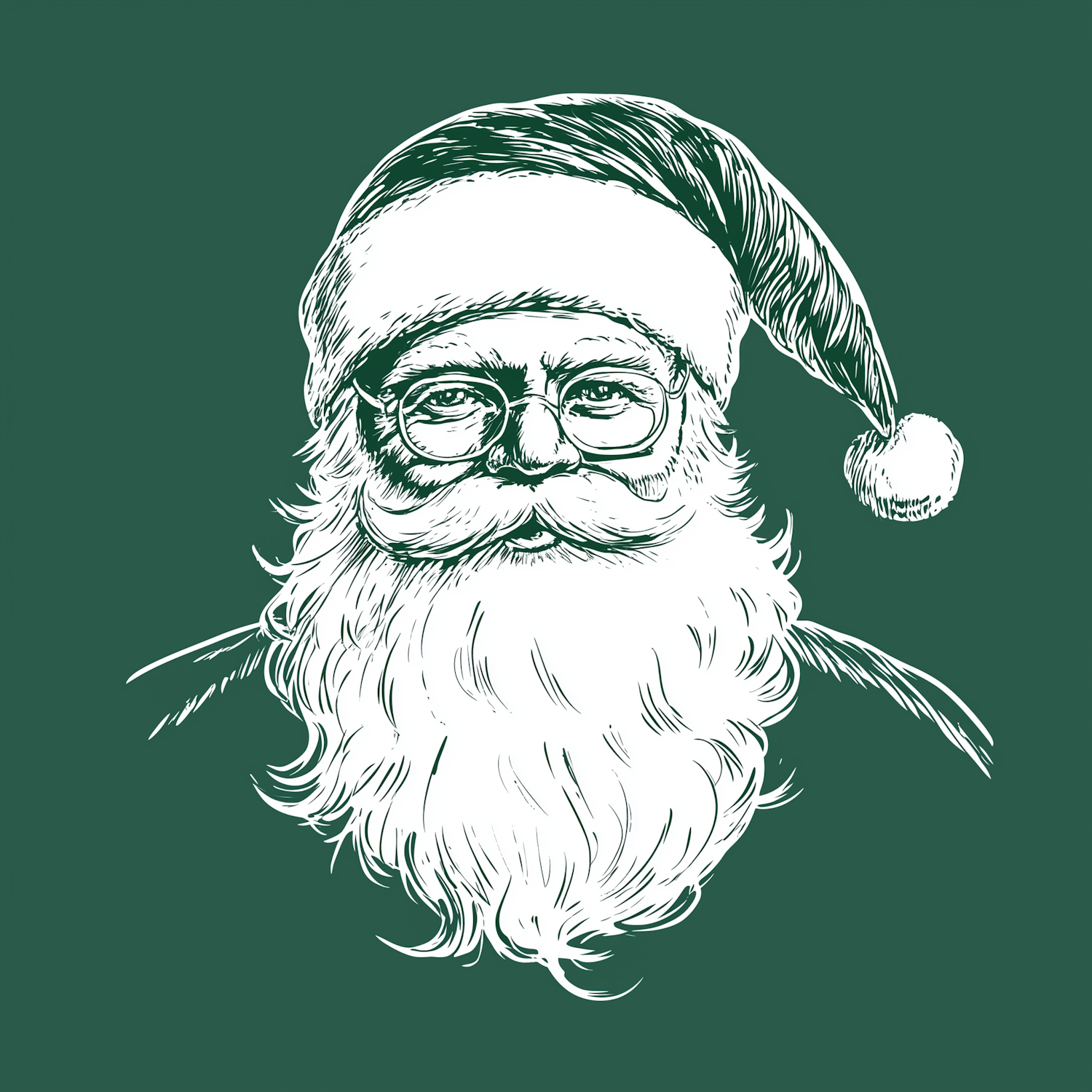 White sketch of Santa Claus with glasses and a fluffy beard on a green background, evoking festive holiday vibes.