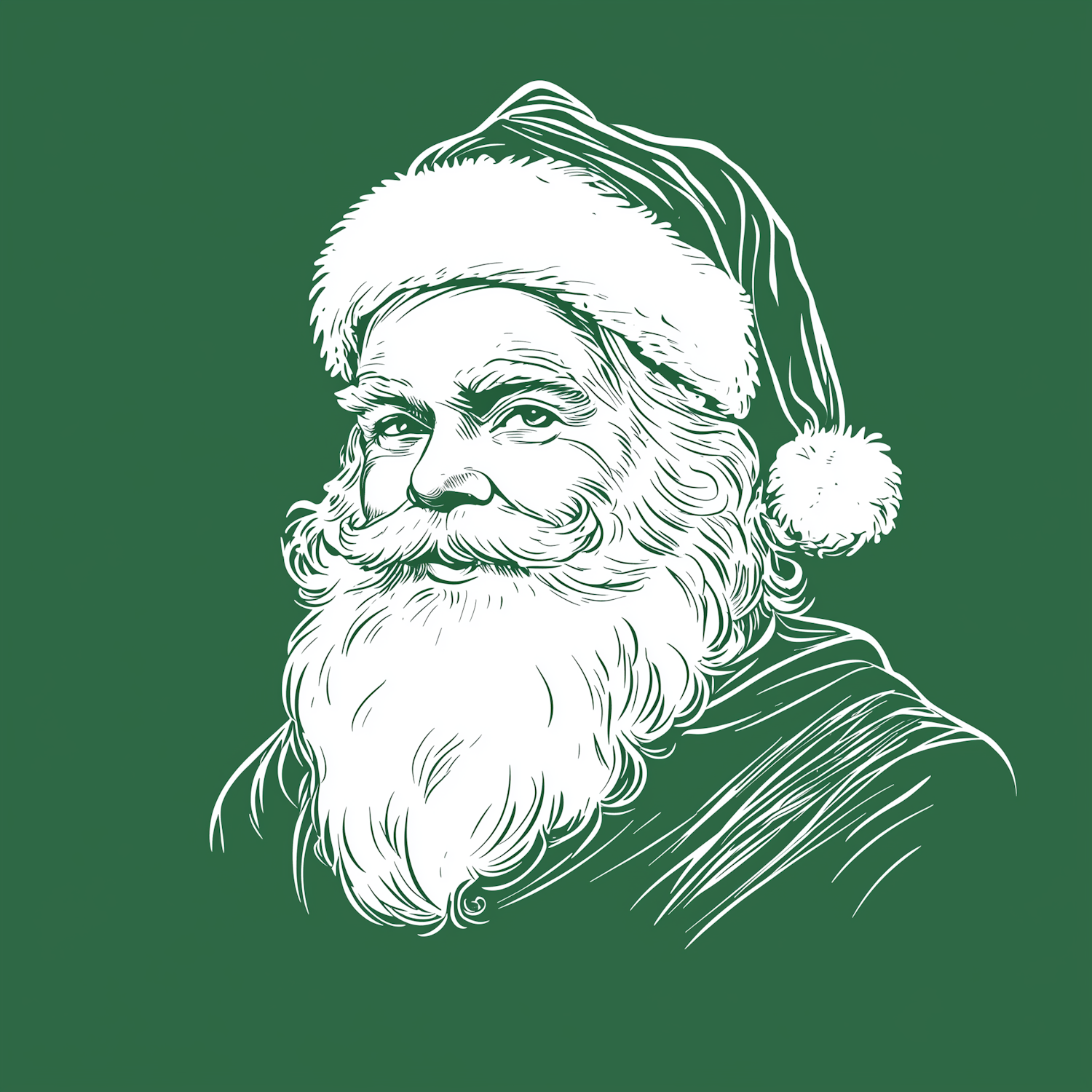 Classic Santa Claus illustration with a jolly expression on a green background, featuring his iconic white beard and red hat.