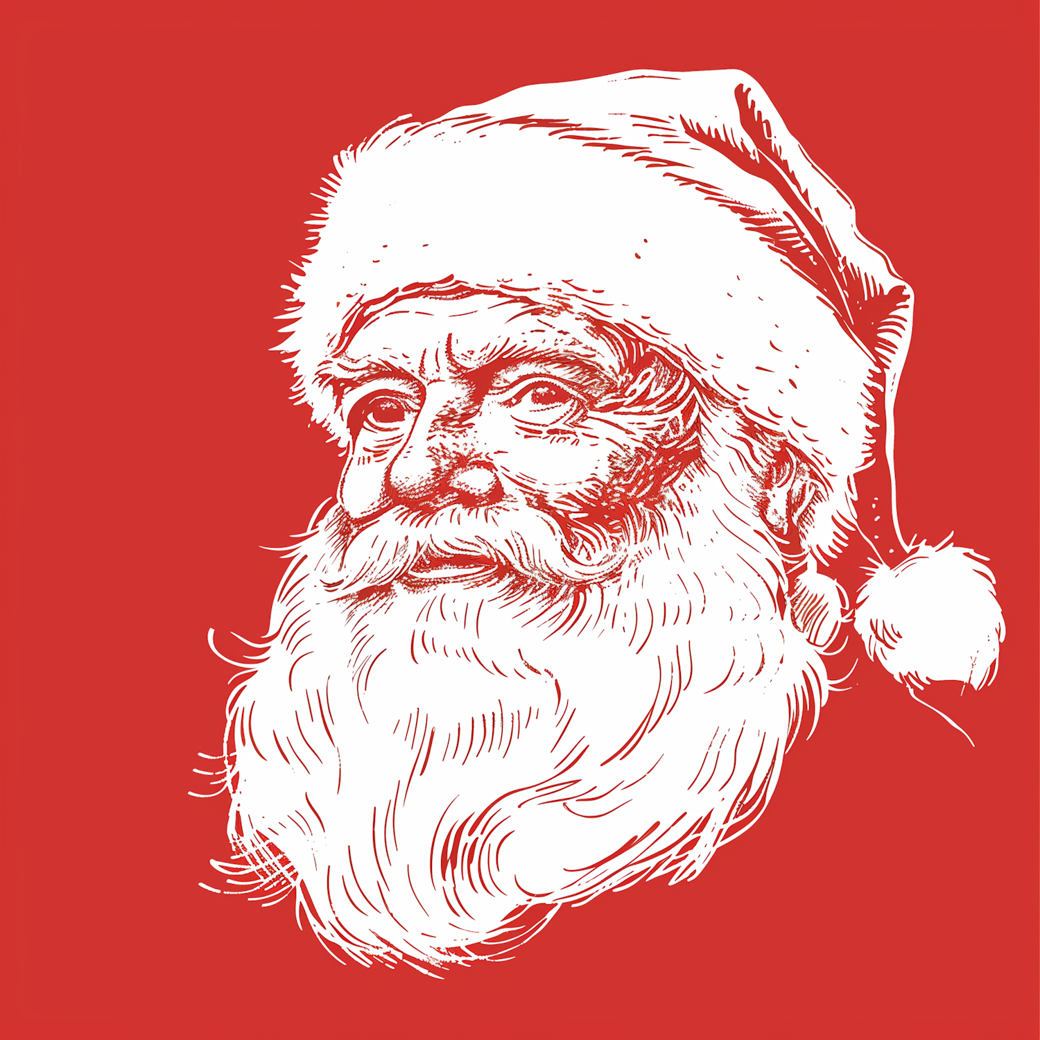 Intricate Santa Claus illustration on a red background, featuring detailed line work and a classic festive look.