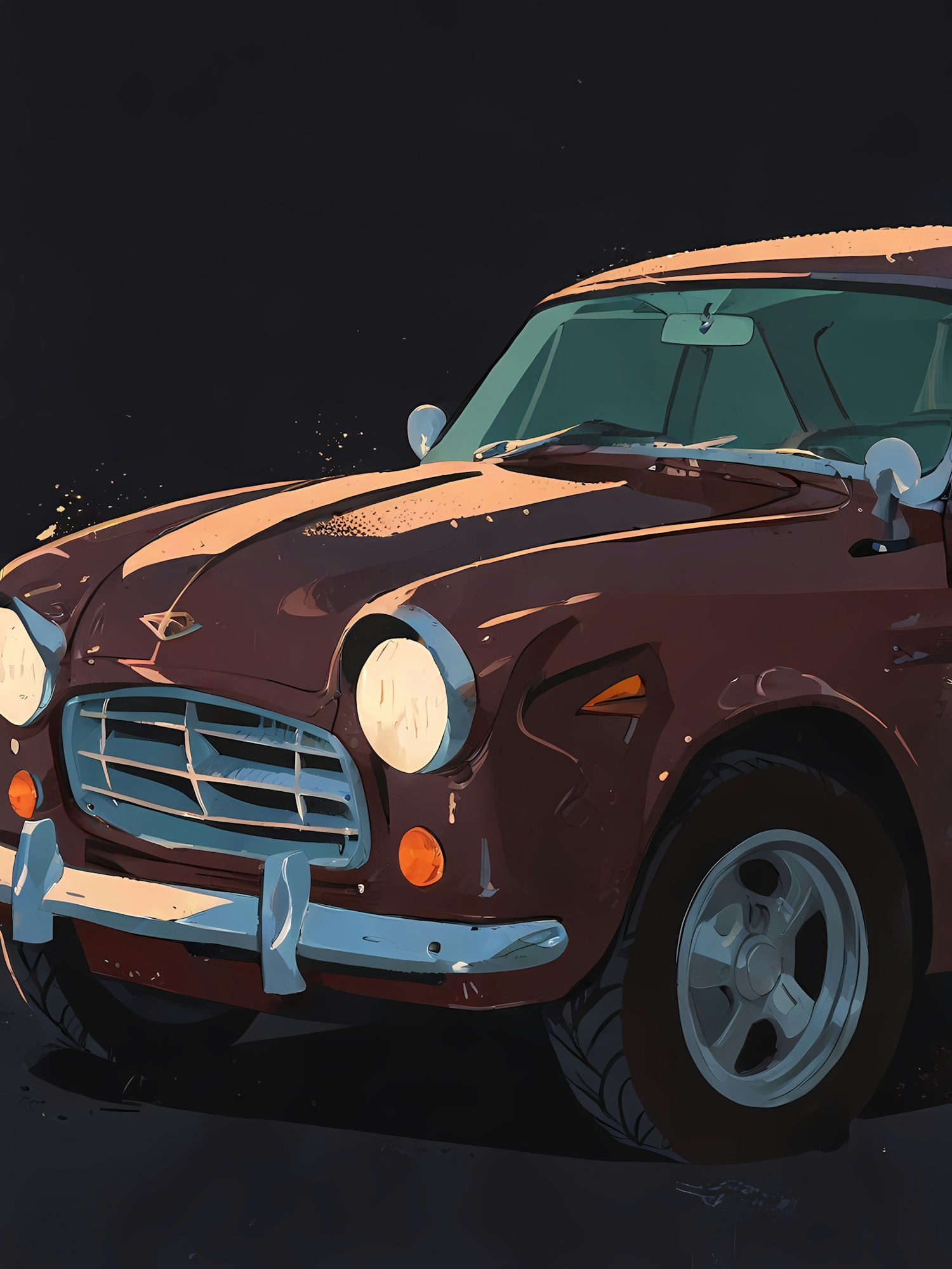 Stylized illustration of a vintage red car with chrome details and round headlights against a dark background.