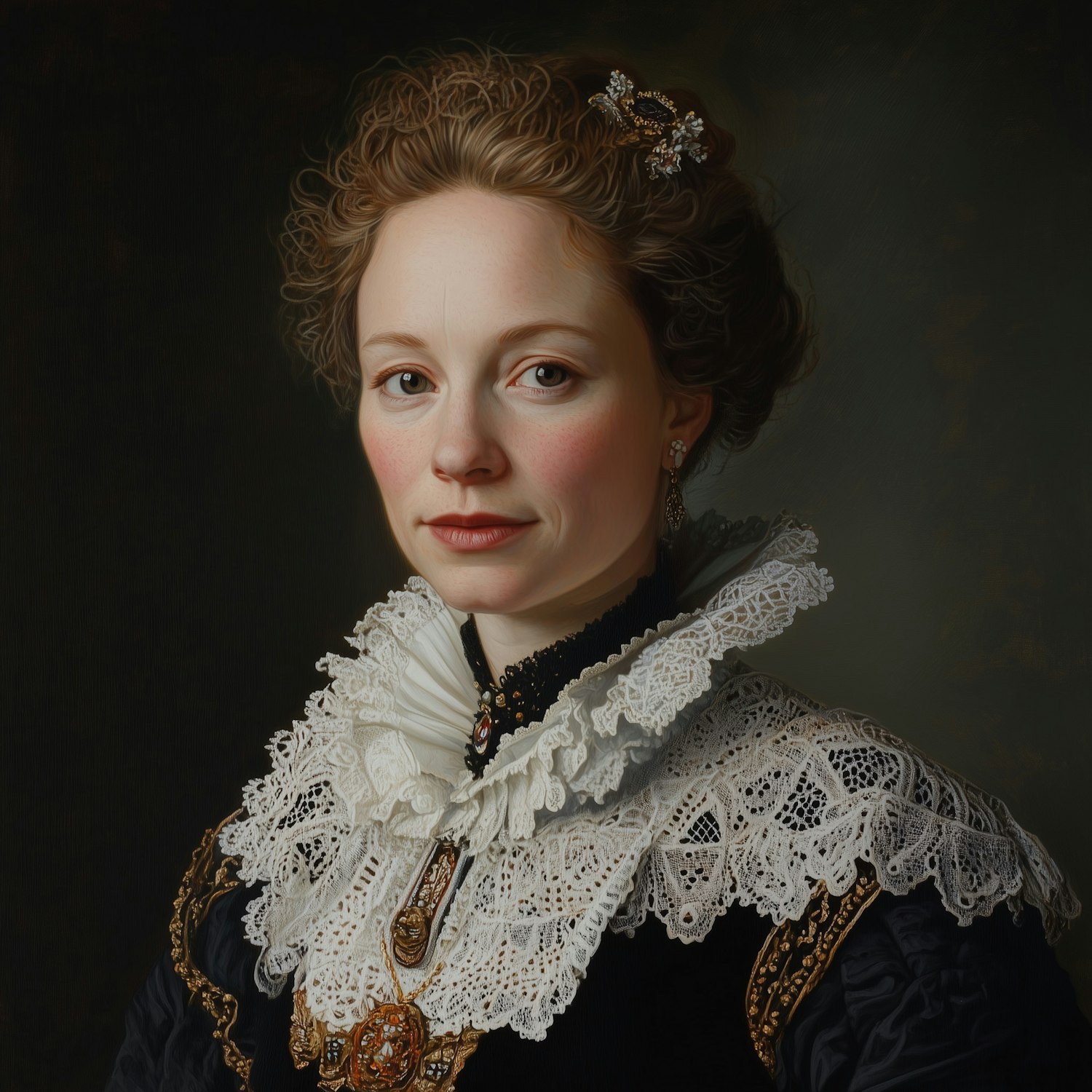 Elegant portrait of a woman in a lace ruff and black dress with gold accents, styled in classical European fashion.