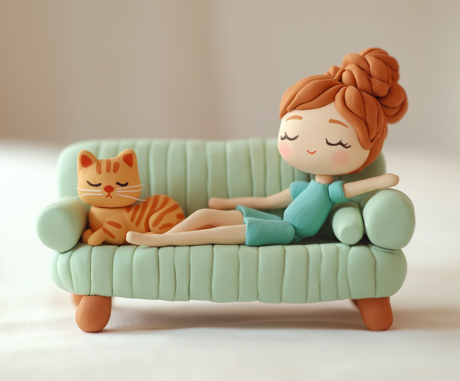 Clay illustration of a girl and cat relaxing on a mint green sofa, featuring soft pastel colors and a serene atmosphere.