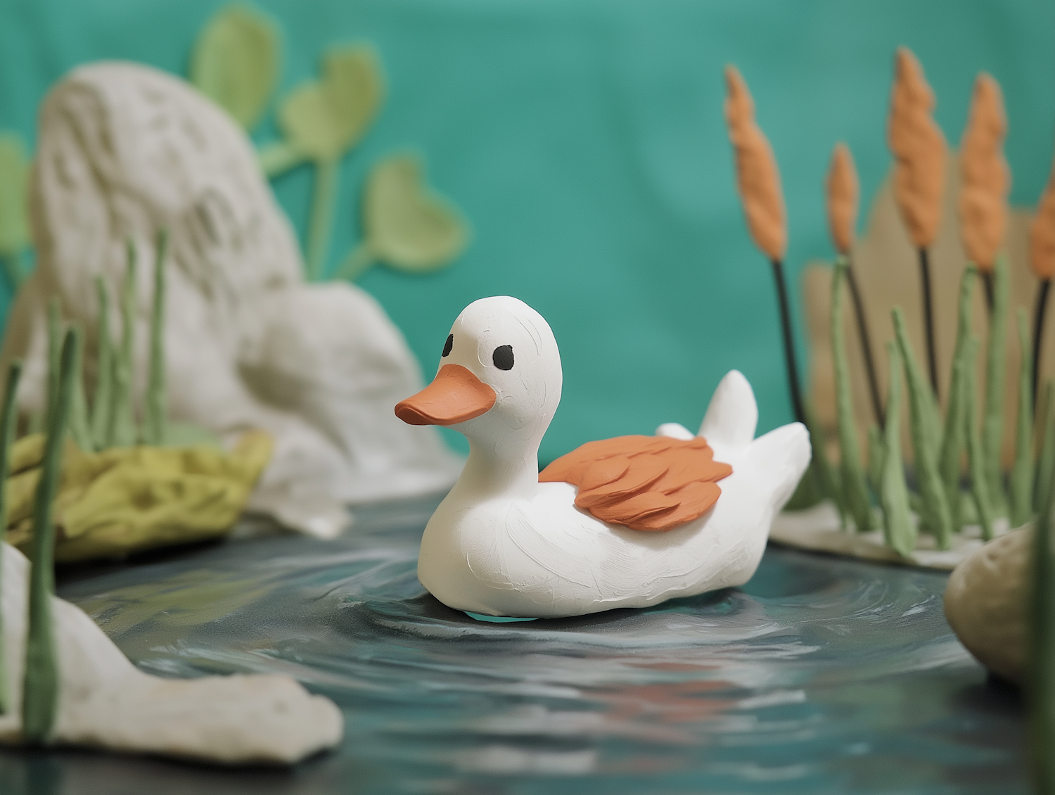 Clay duck model on a pond with cattails and rocks, set against a teal backdrop. Whimsical and serene handcrafted scene.
