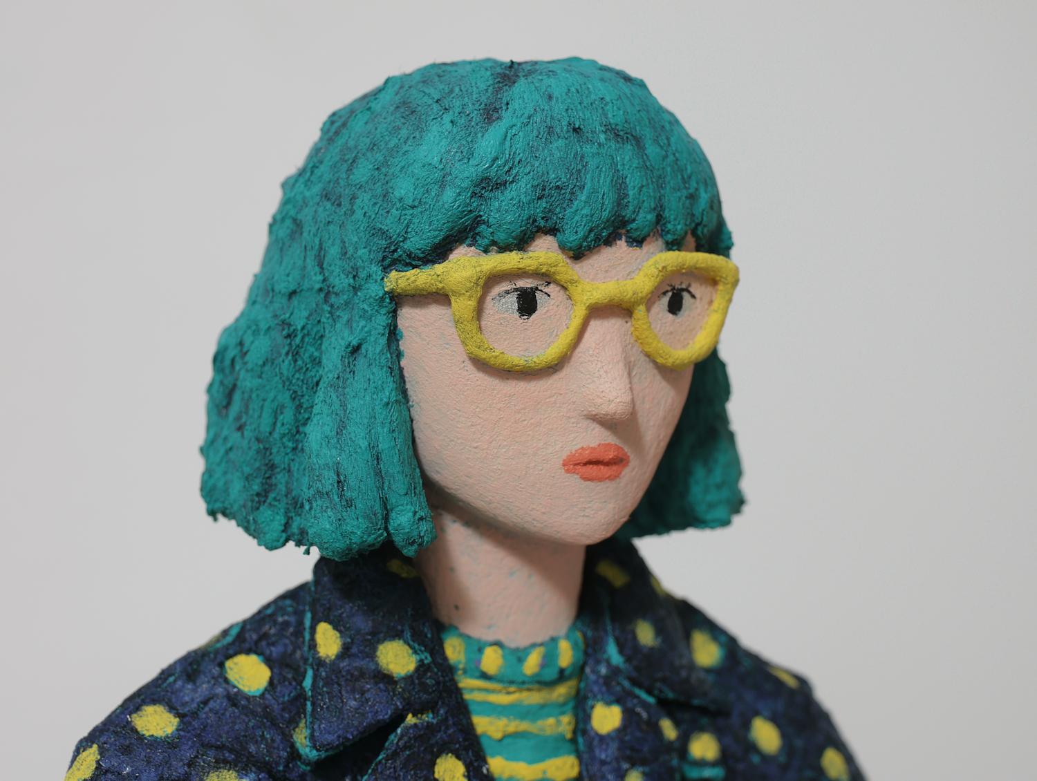 Clay sculpture of a person with teal hair, yellow glasses, and a patterned outfit, showcasing intricate textures and vibrant colors.