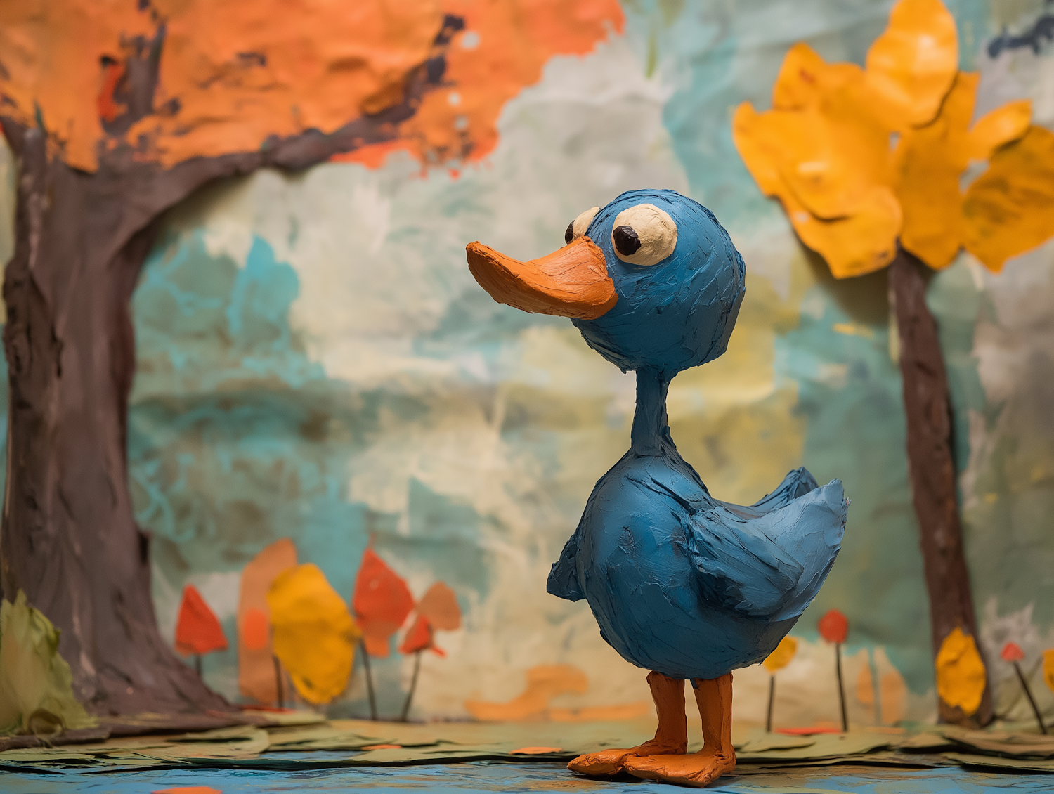 Whimsical claymation scene of a blue duck with an orange beak in a colorful autumn setting with handcrafted trees and leaves.