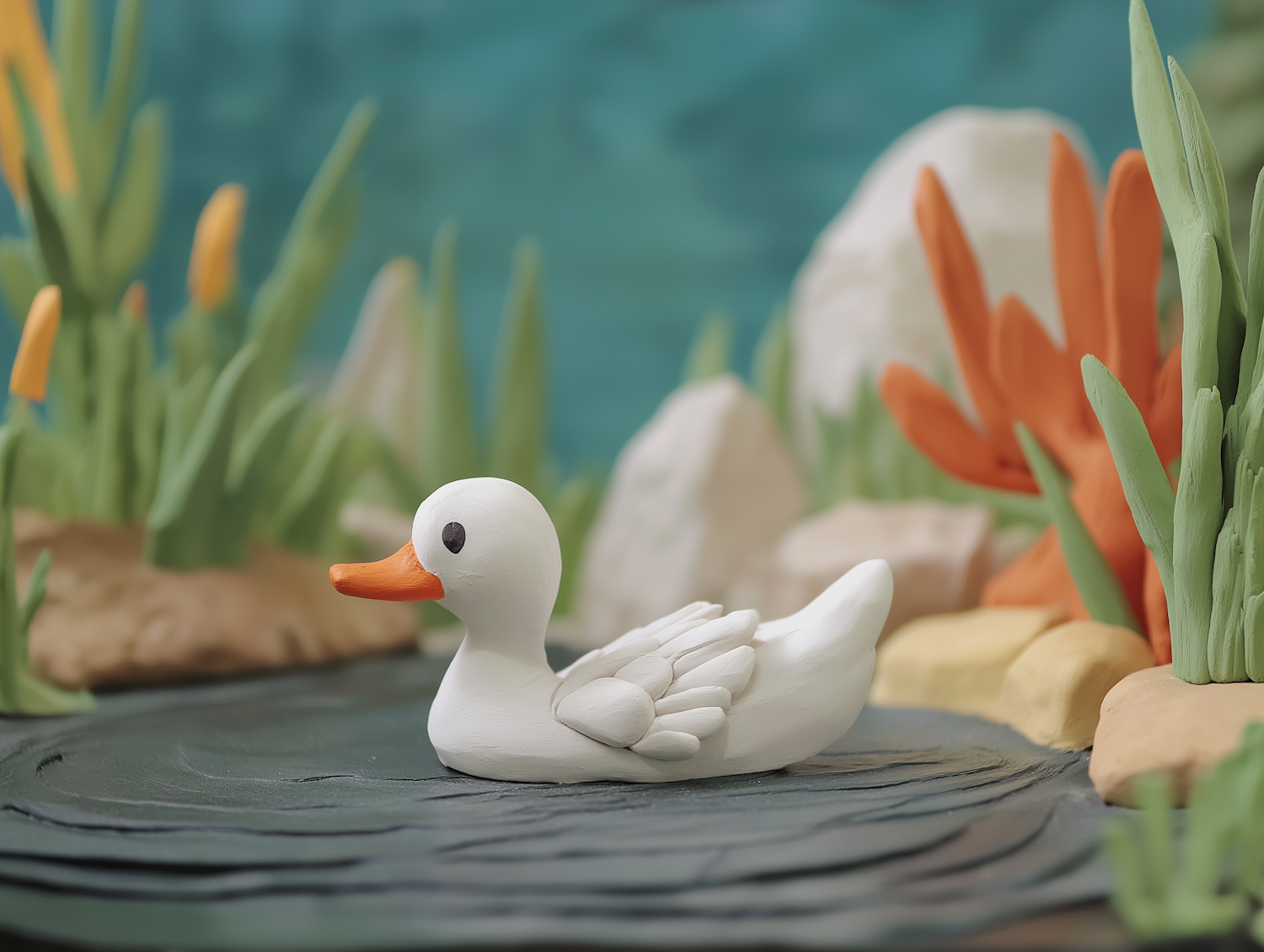 Clay duck sculpture on a pond with vibrant plants and rocks, creating a whimsical and serene scene.