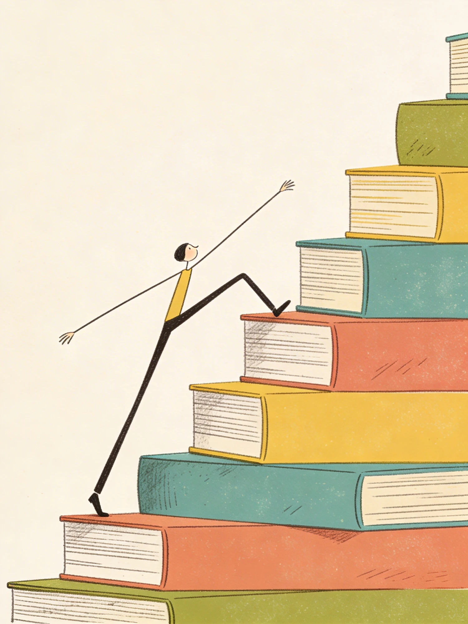 A tall, thin character climbing a staircase made of books, long legs stretched across steps elongated limbs, flat minimal shapes, rough pencil outlines, risograph grain, mid‑century modern colours, playful editorial style.