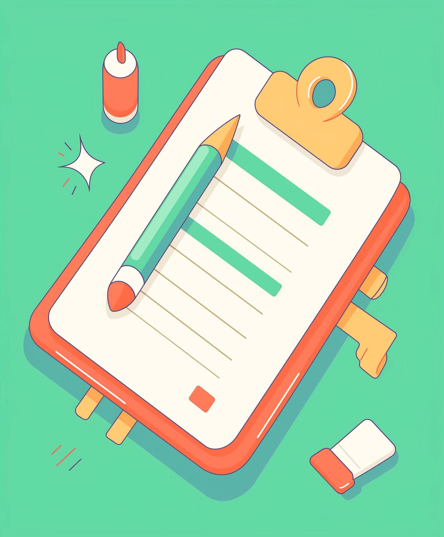 Colorful illustration of a clipboard with a pencil, glue, and eraser on a teal background. Perfect for stationery or office themes.