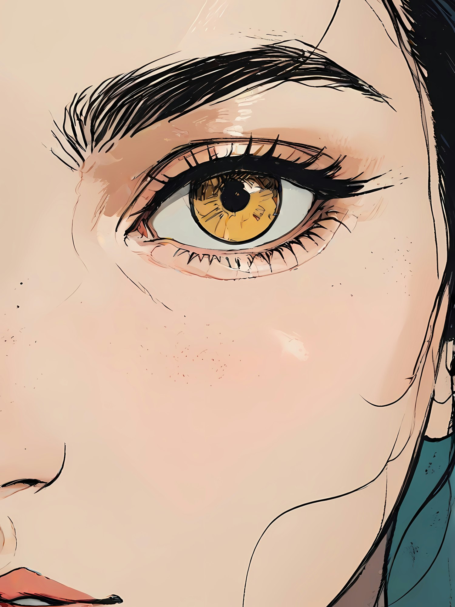 Close-up illustration of a golden-brown eye with detailed iris, long lashes, and subtle freckles on smooth skin.