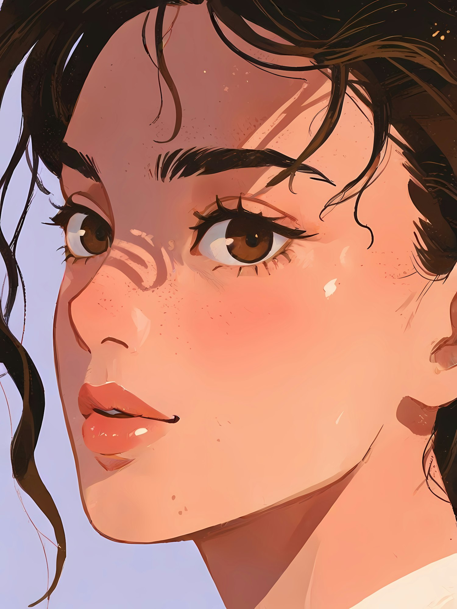 Close-up illustration of a young woman with brown eyes and dark hair, featuring soft lighting and a serene lavender background.