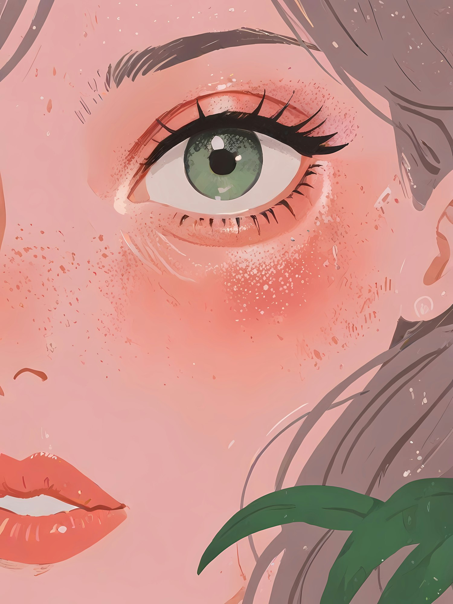 Close-up illustration of a green eye with freckles and coral lips, framed by gray hair and a green leaf.