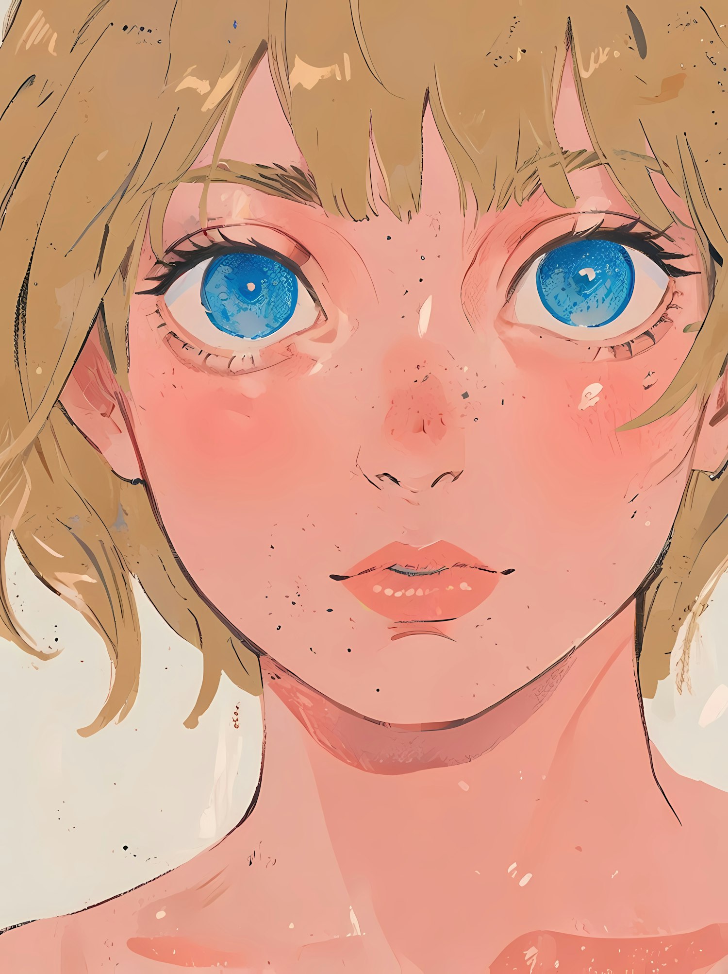 Anime-style illustration of a young person with large blue eyes, blonde hair, and freckles, showcasing a soft and expressive look.