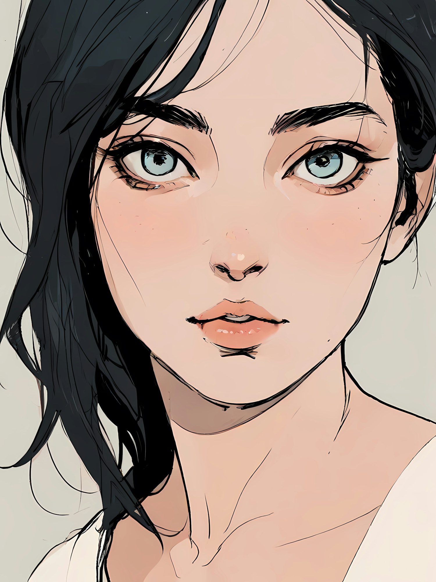 Illustration of a person with long black hair and blurred face, showcasing detailed hair texture and soft, muted color palette.