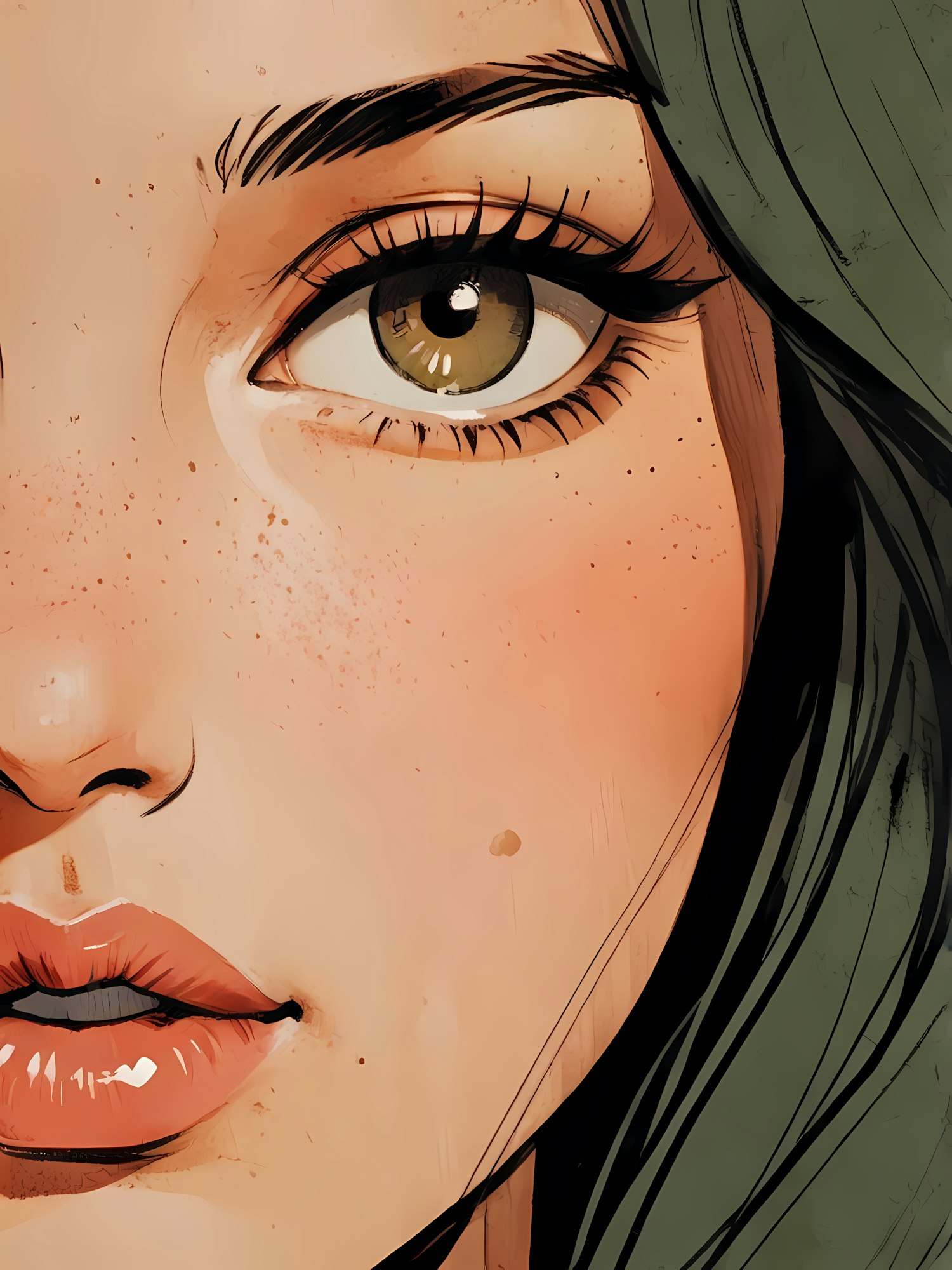 Close-up illustration of a woman's eye and lips, featuring freckles and detailed textures in a realistic style.