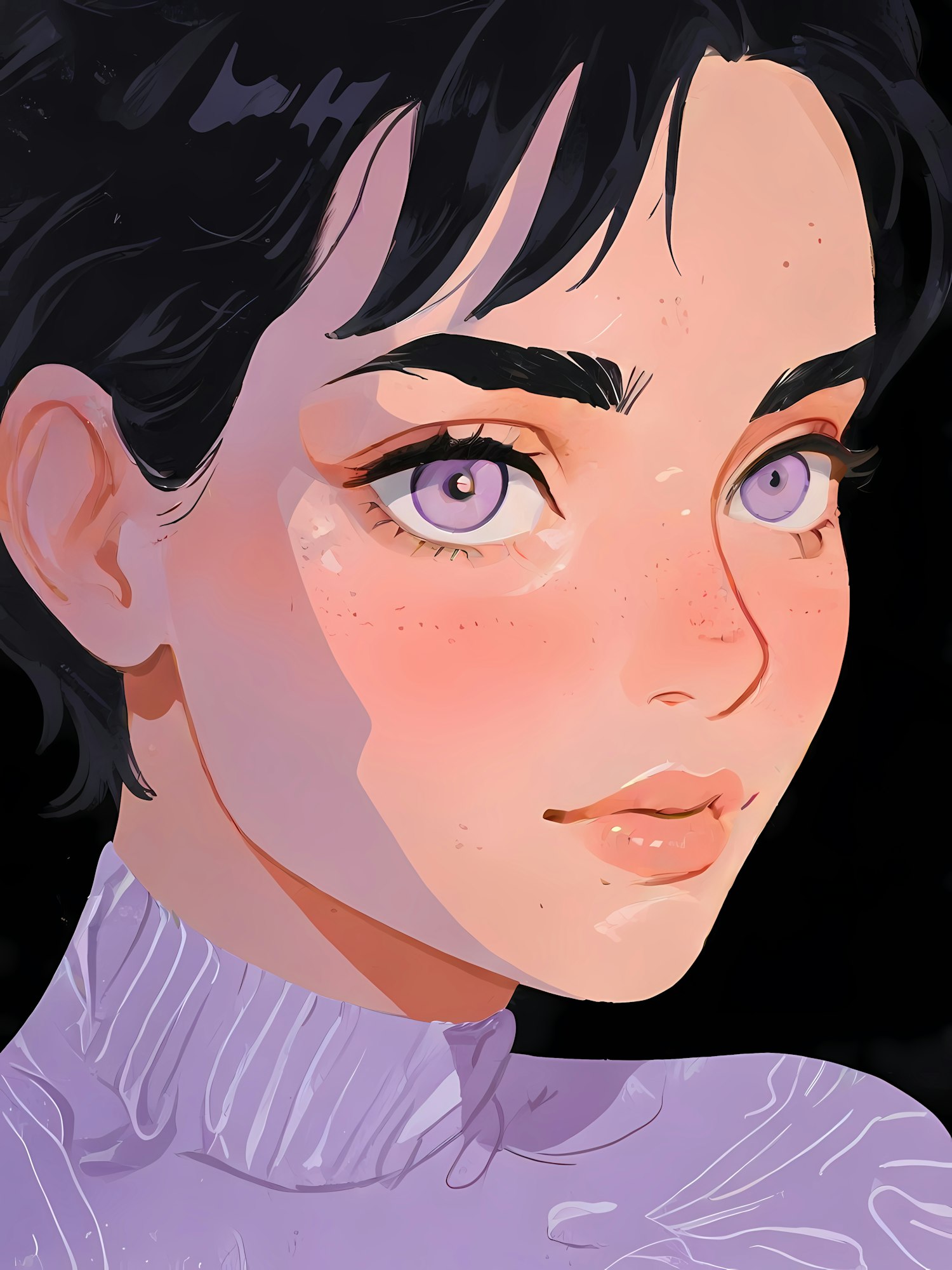 Digital illustration of a person with purple eyes, black hair, and freckles, wearing a purple turtleneck against a black background.