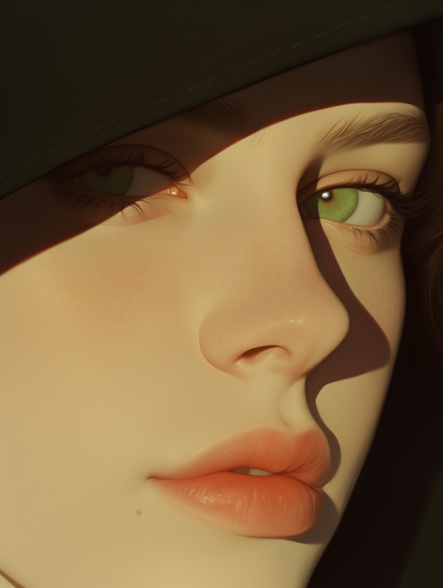 Close-up illustration of a face with green eyes, fair skin, and pink lips, partially shadowed by a dark hat.