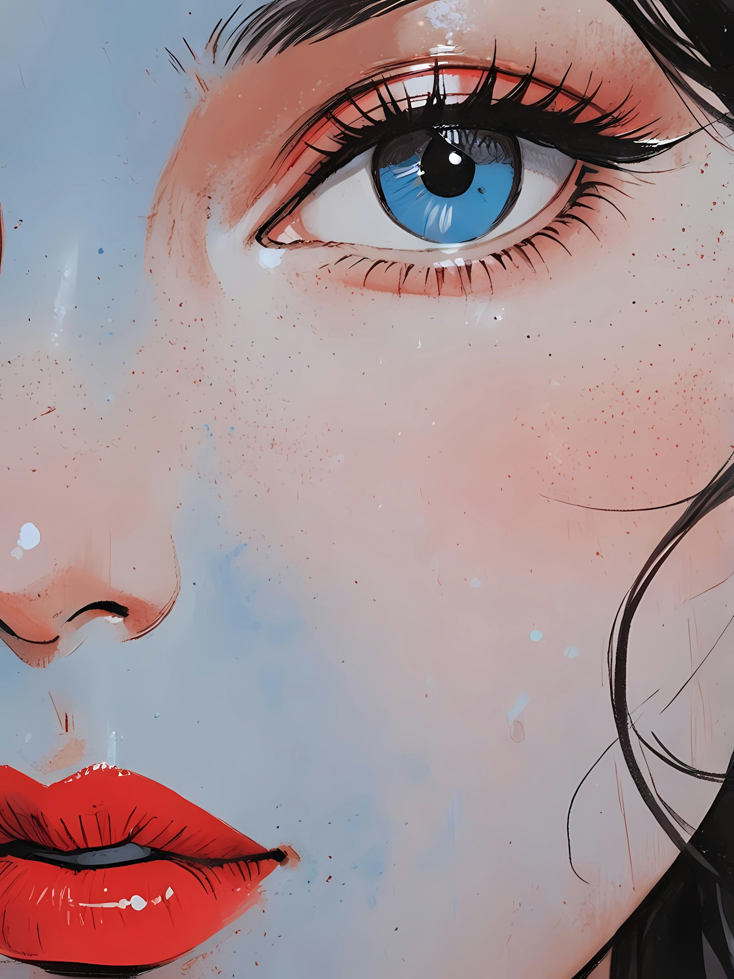 Close-up illustration of a woman's face with blue eyes, red lips, and freckles, featuring a soft pastel color palette.