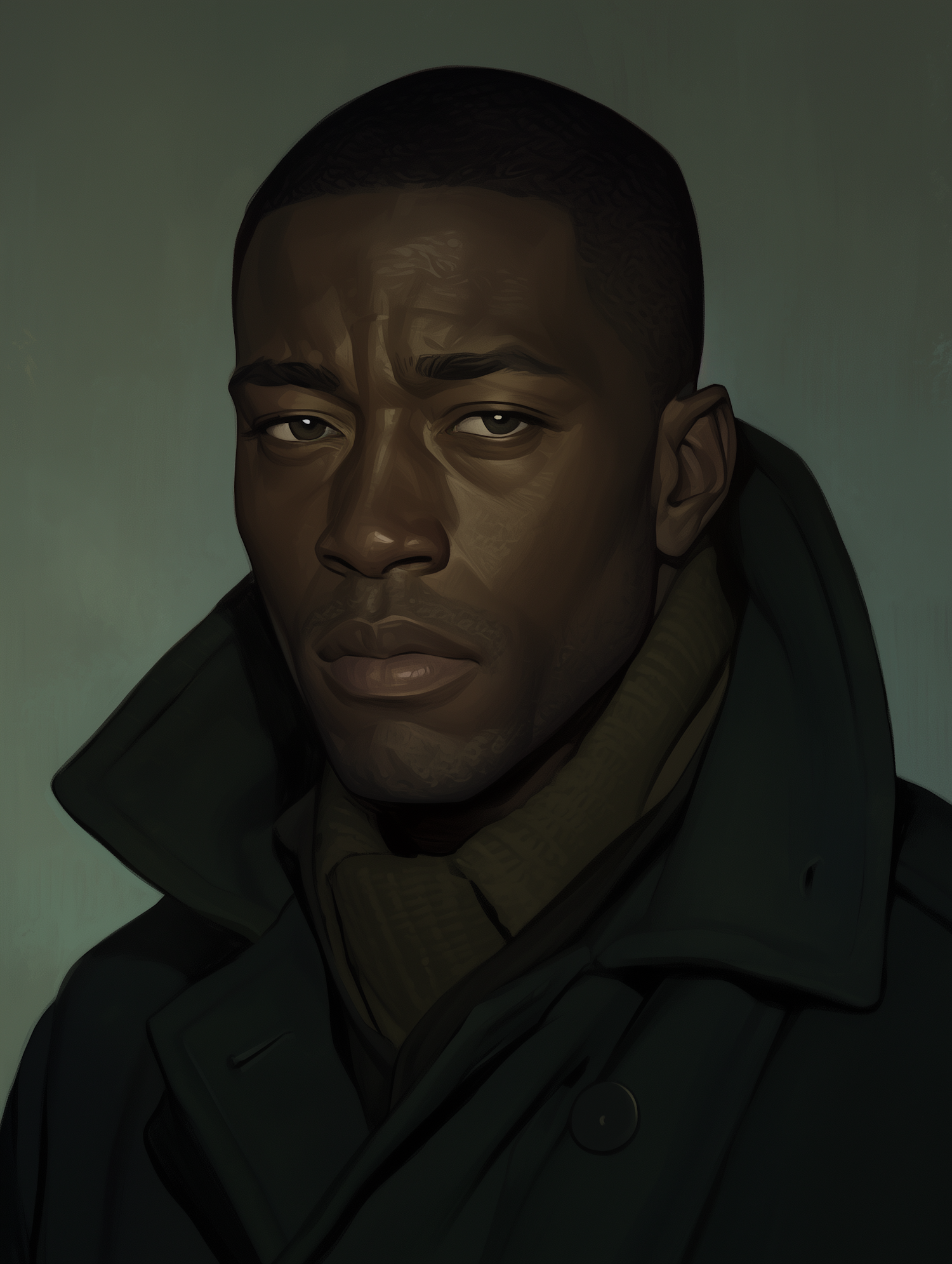 Portrait of a Black man in a dark coat and scarf, with a serious expression against a muted green background.
