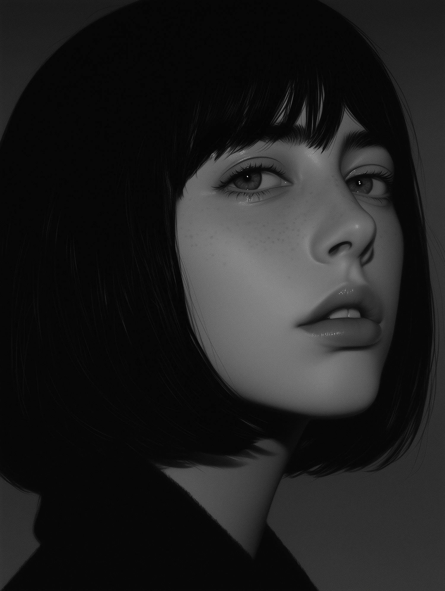 Monochromatic portrait of a young woman with a sleek bob, intense gaze, and delicate freckles, exuding a dramatic and artistic vibe.