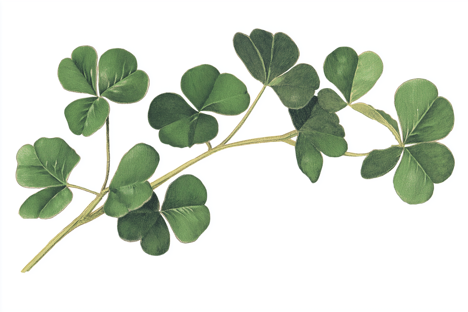 A detailed illustration of a vibrant green clover plant with heart-shaped leaves on a clean white background.