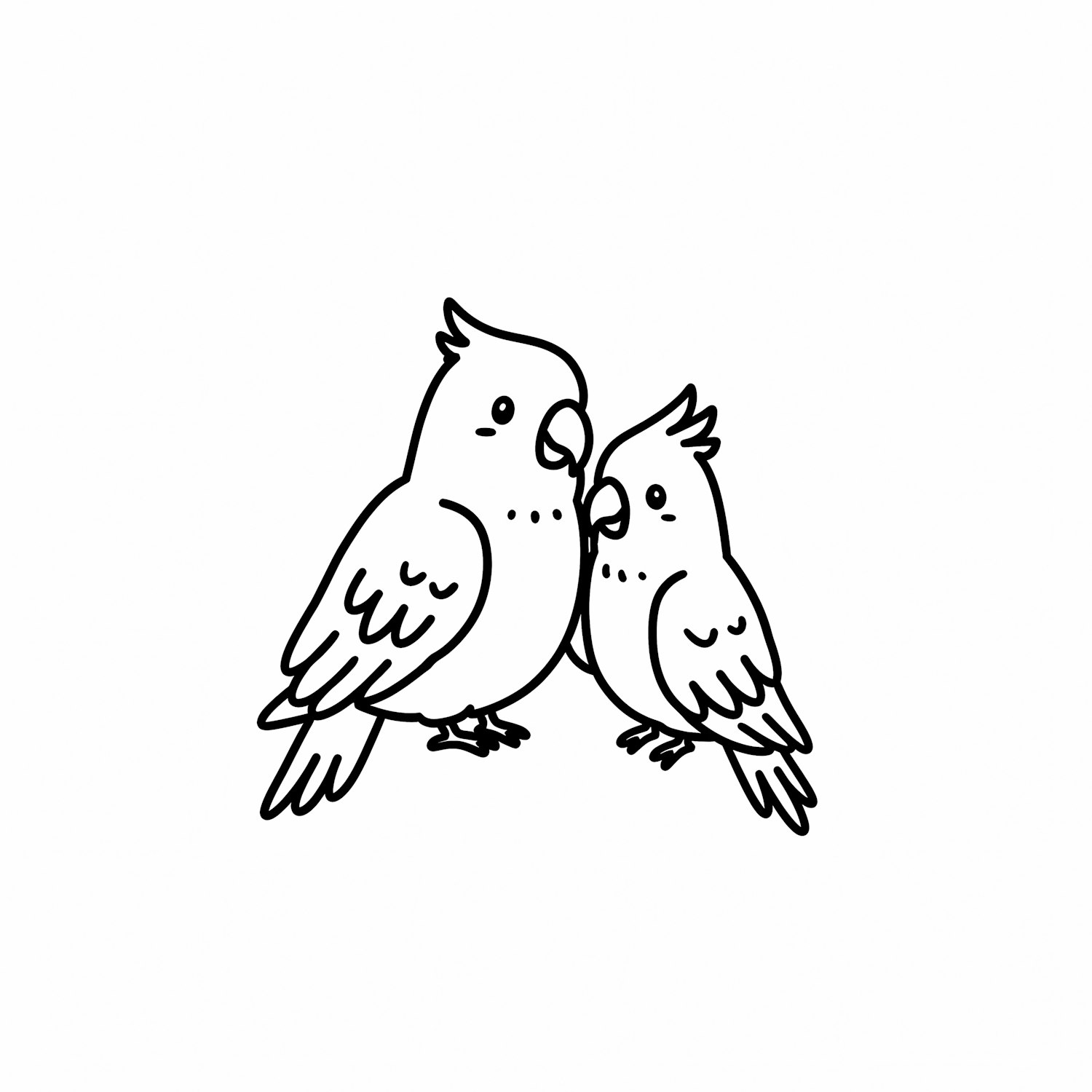 A charming black-and-white line drawing of two cockatiels interacting, perfect for coloring or as a minimalist art piece.