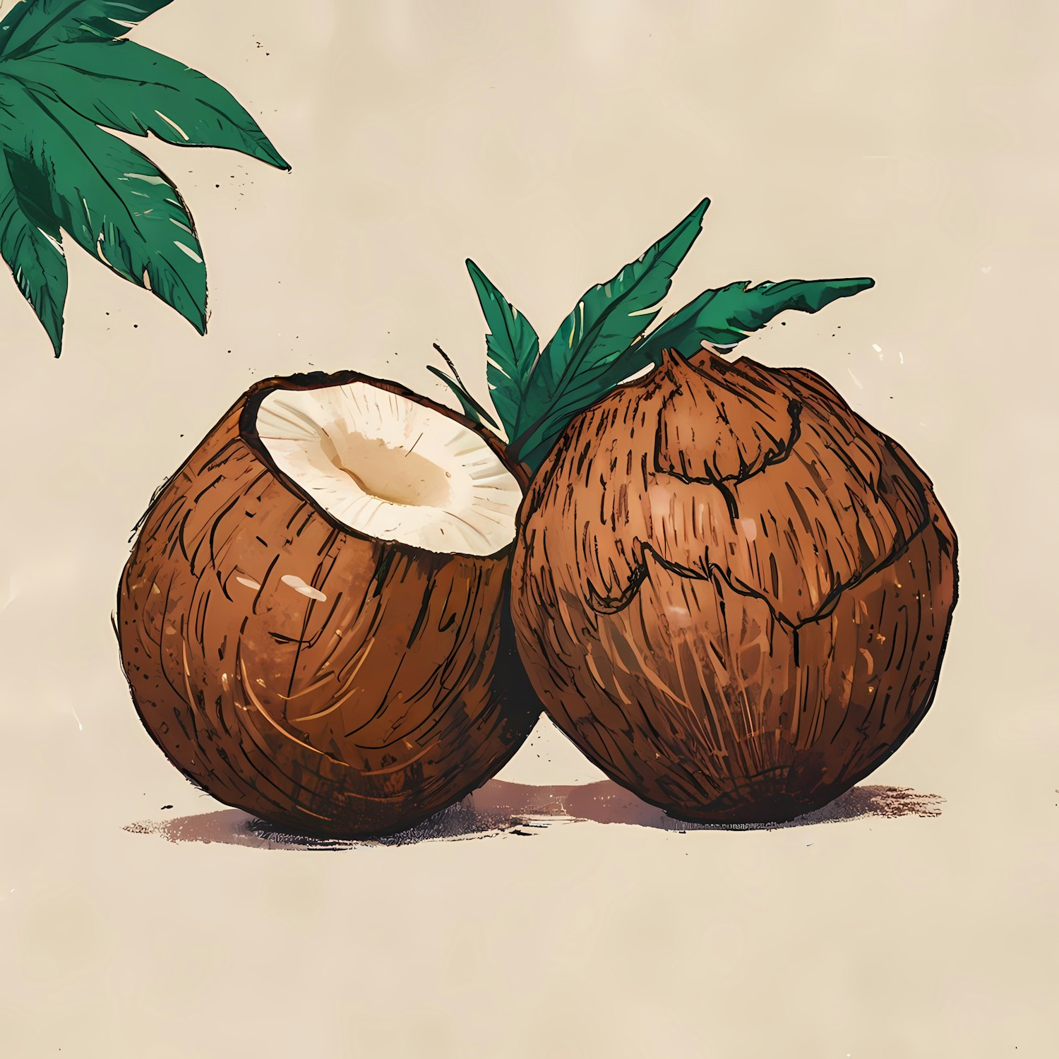 Illustration of two coconuts, one whole and one split open, with green leaves on a beige background.