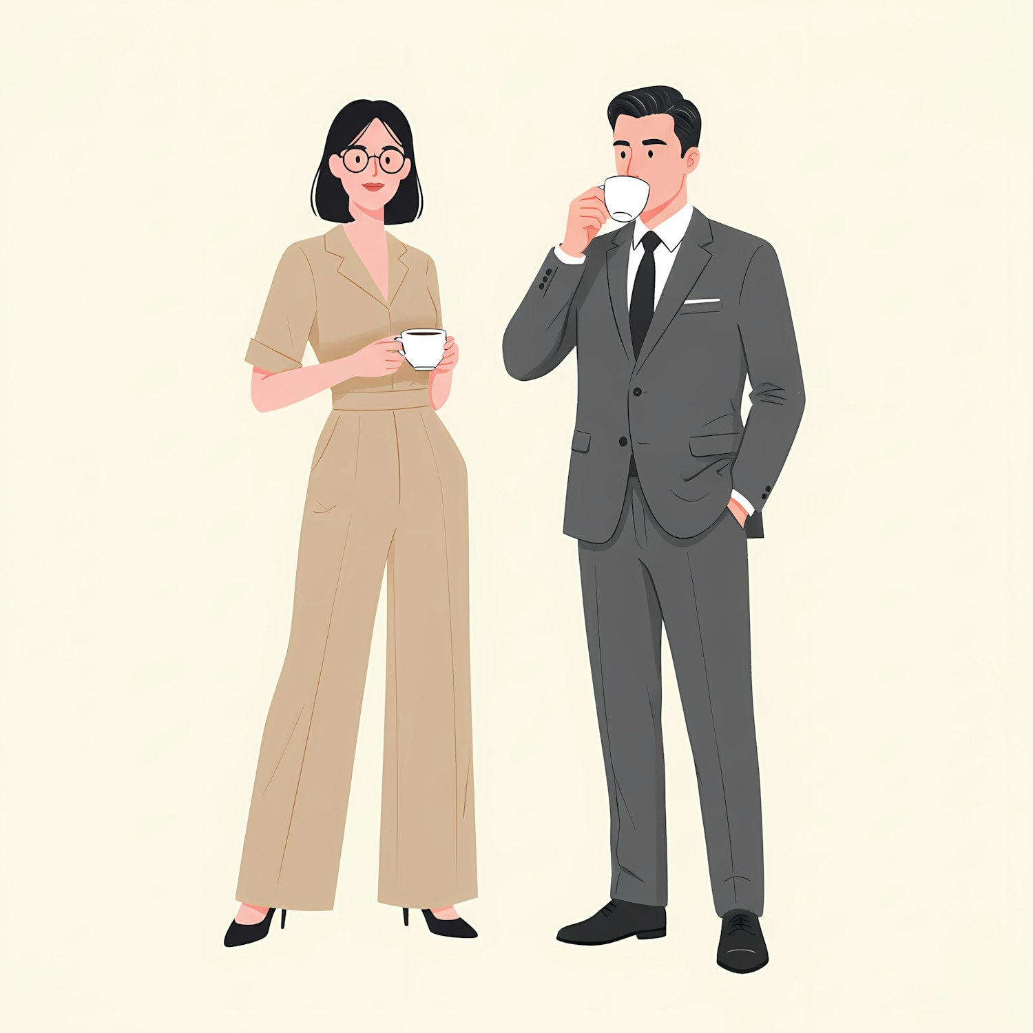 Illustration of a man in a gray suit and a woman in a beige jumpsuit, both holding coffee cups, against a light background.