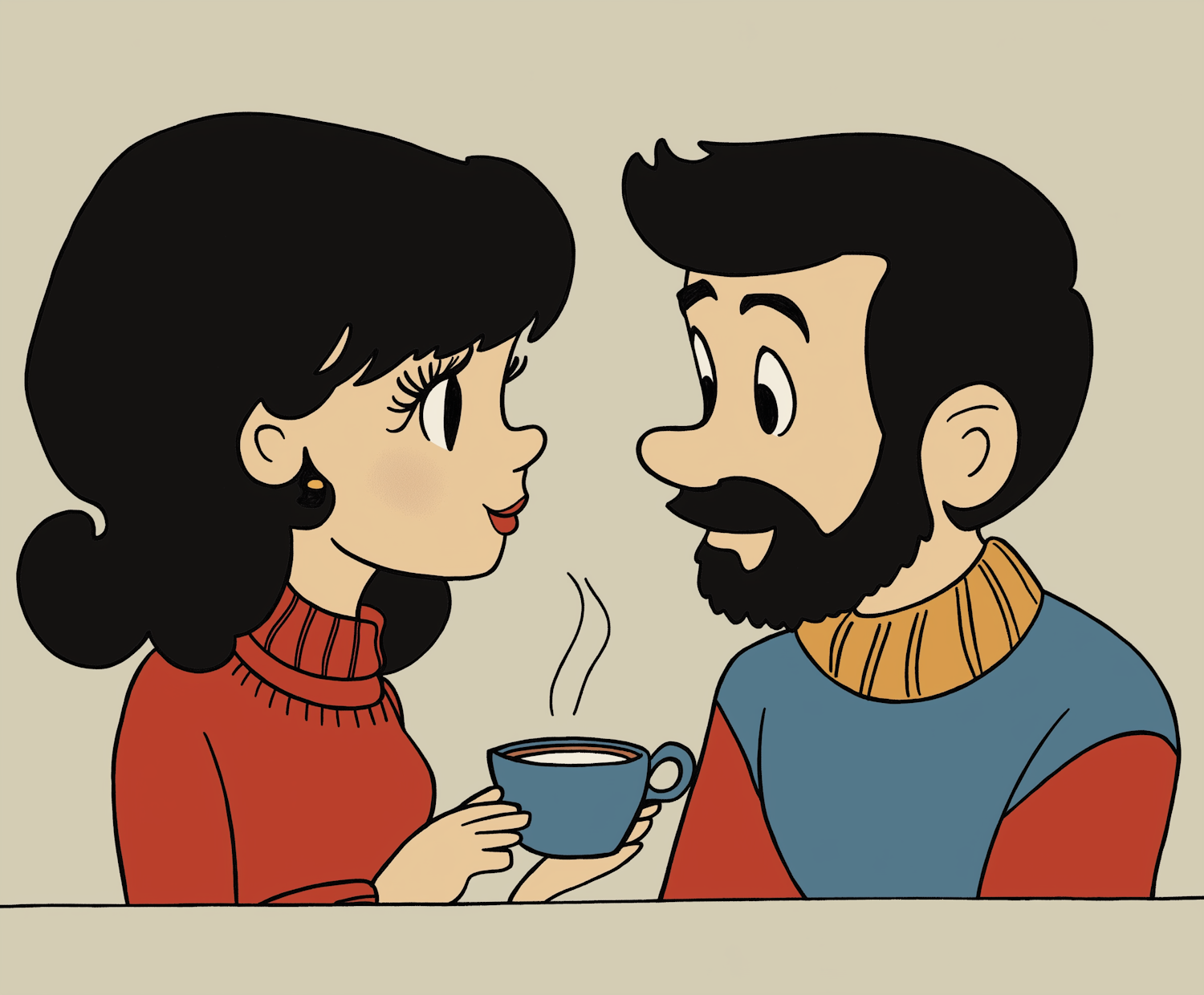 Cartoon illustration of a couple sharing coffee, featuring warm colors and a cozy, affectionate vibe.