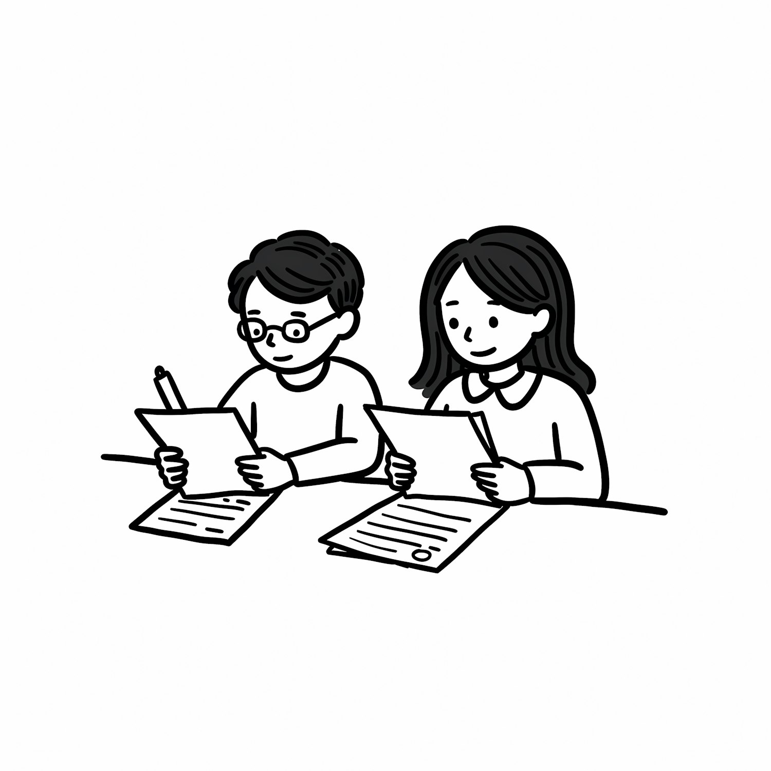 Minimalistic black-and-white illustration of two people reading documents at a table, suggesting a collaborative or academic setting.