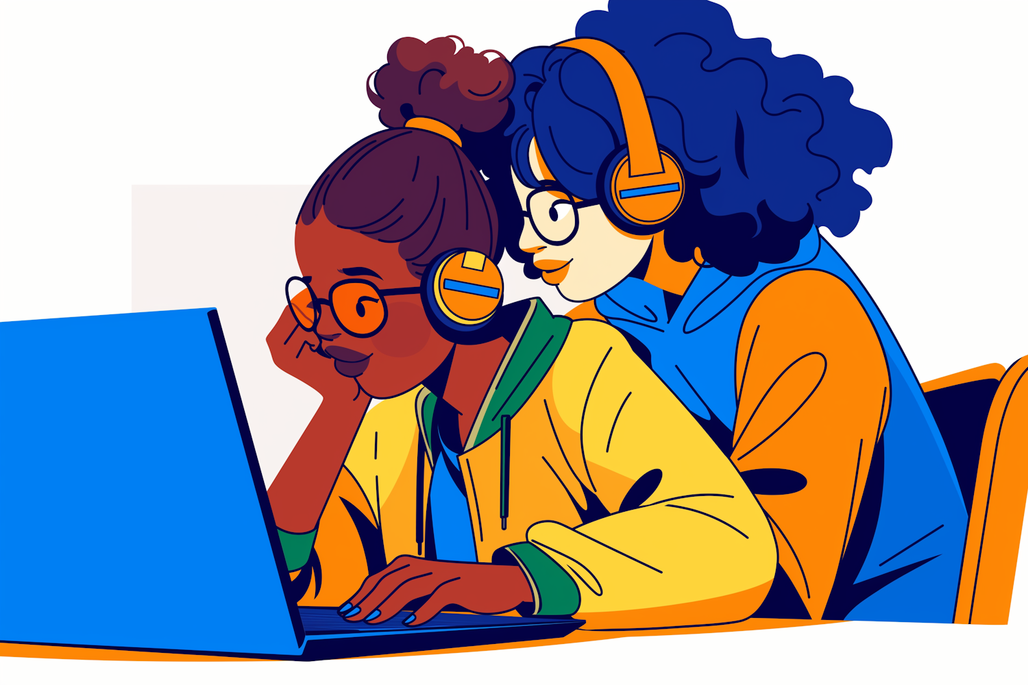 Two people with headphones and glasses focus on a laptop, depicted in a vibrant, colorful illustration with bold blue, yellow, and orange hues.