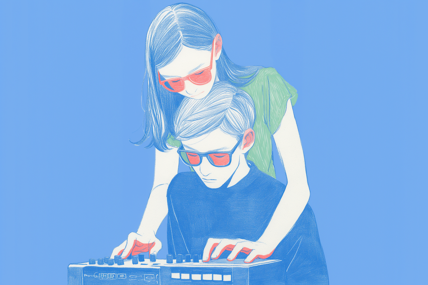 Stylized illustration of two people with red sunglasses, playing a keyboard. Modern art with a blue and red color scheme.