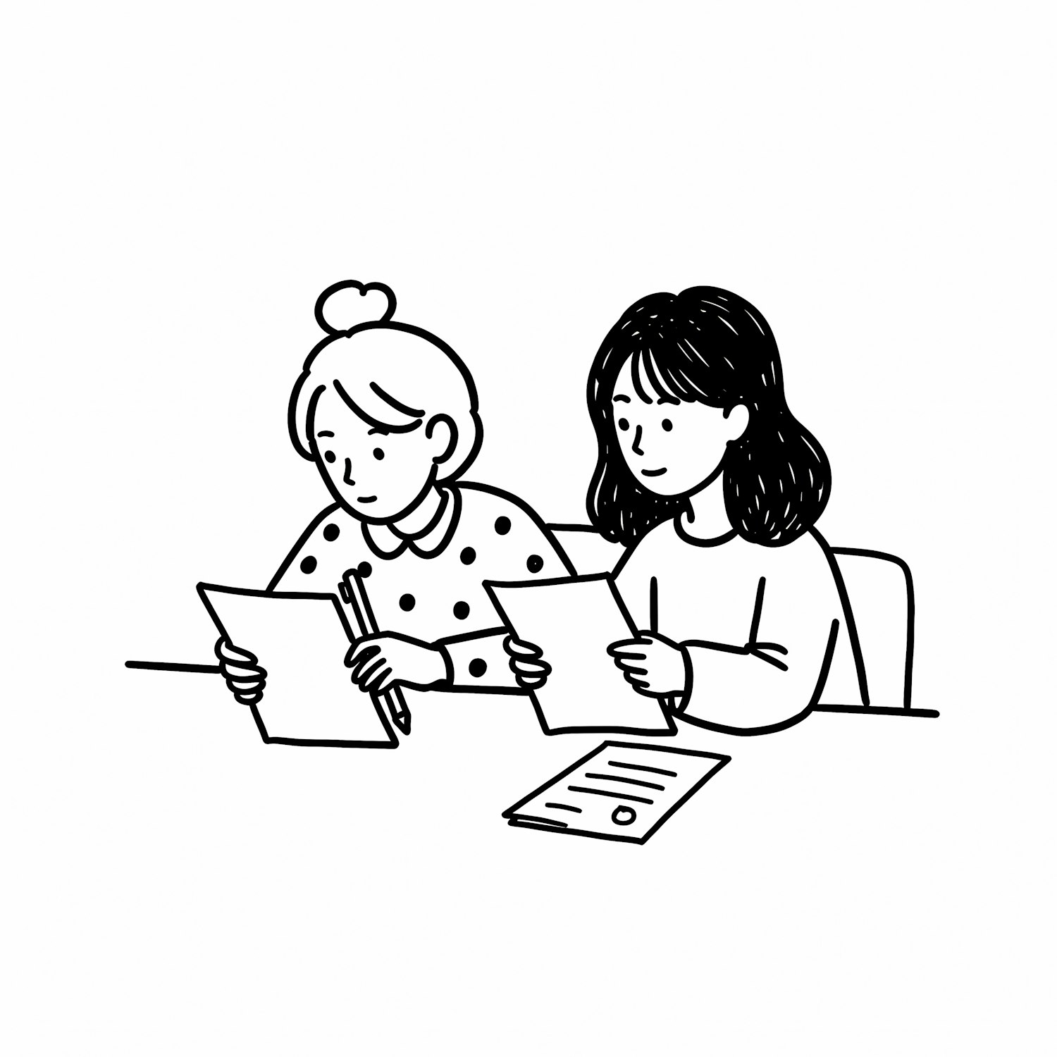 Black-and-white illustration of two people reviewing documents at a table, showcasing a collaborative or study setting.